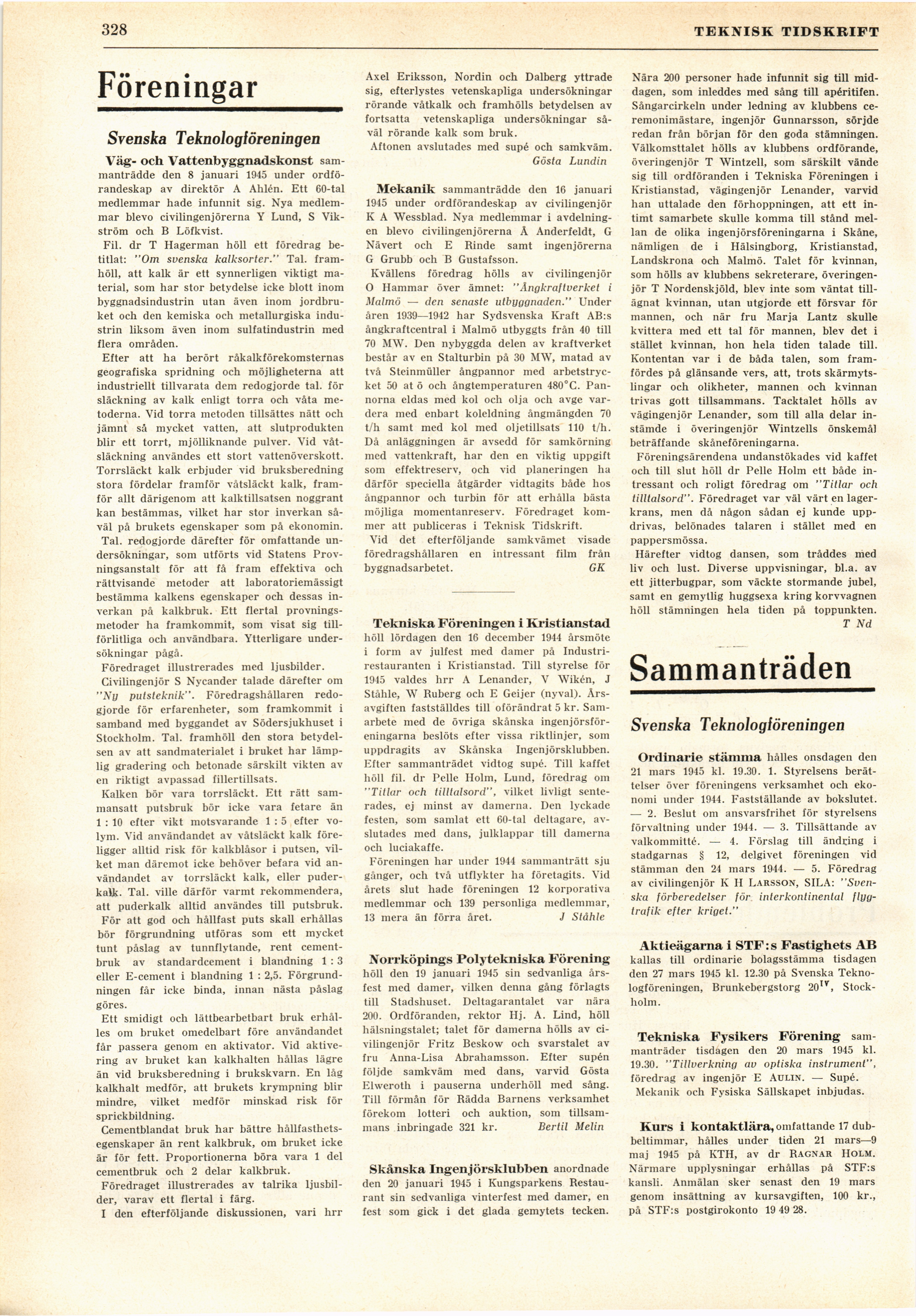 Full resolution (JPEG) - On this page / på denna sida - H. 11. 17 mars 1945 - Föreningar - Svenska Teknologföreningen. Väg- och Vattenbyggnadskonst, av Gösta Lundin - Mekanik, av GK - Tekniska Föreningen i Kristianstad, av J Ståhle - Norrköpings Polytekniska Förening, av Bertil Melin - Skånska Ingenjörsklubben, av T Nd - Sammanträden
