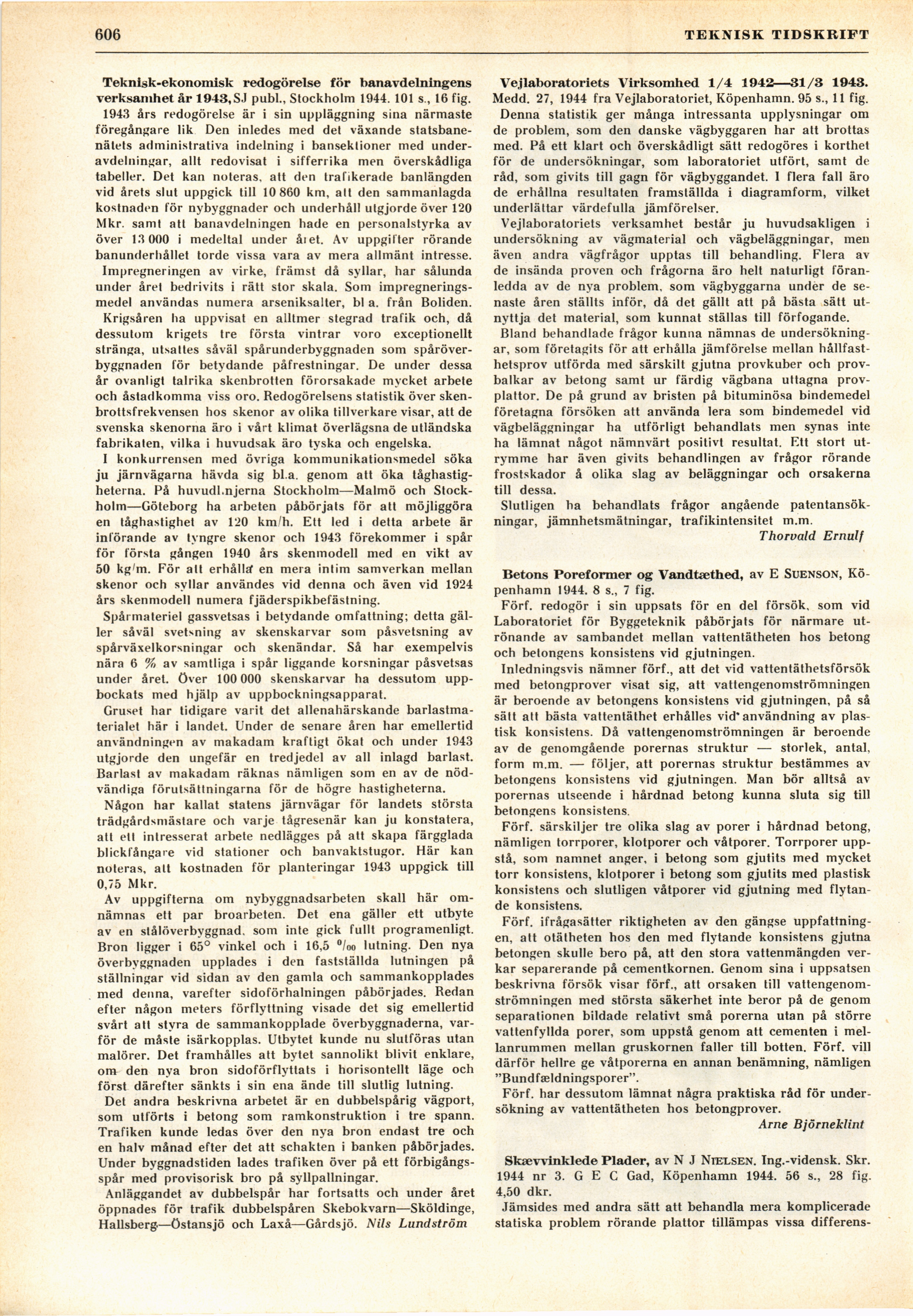 Full resolution (JPEG) - On this page / på denna sida - H. 21. 26 maj 1945 - Teknisk-ekonomisk redogörelse för banavdelningens verksamhet år 1943, av Nils Lundström - Vejlaboratoriets Virksomhed 1/4 1942—31/3 1943, av Thorvald Ernulf - Betons Poreformer og Vandtæthed, av Arne Björneklint - Skævvinklede Plader, av Åke Holmberg