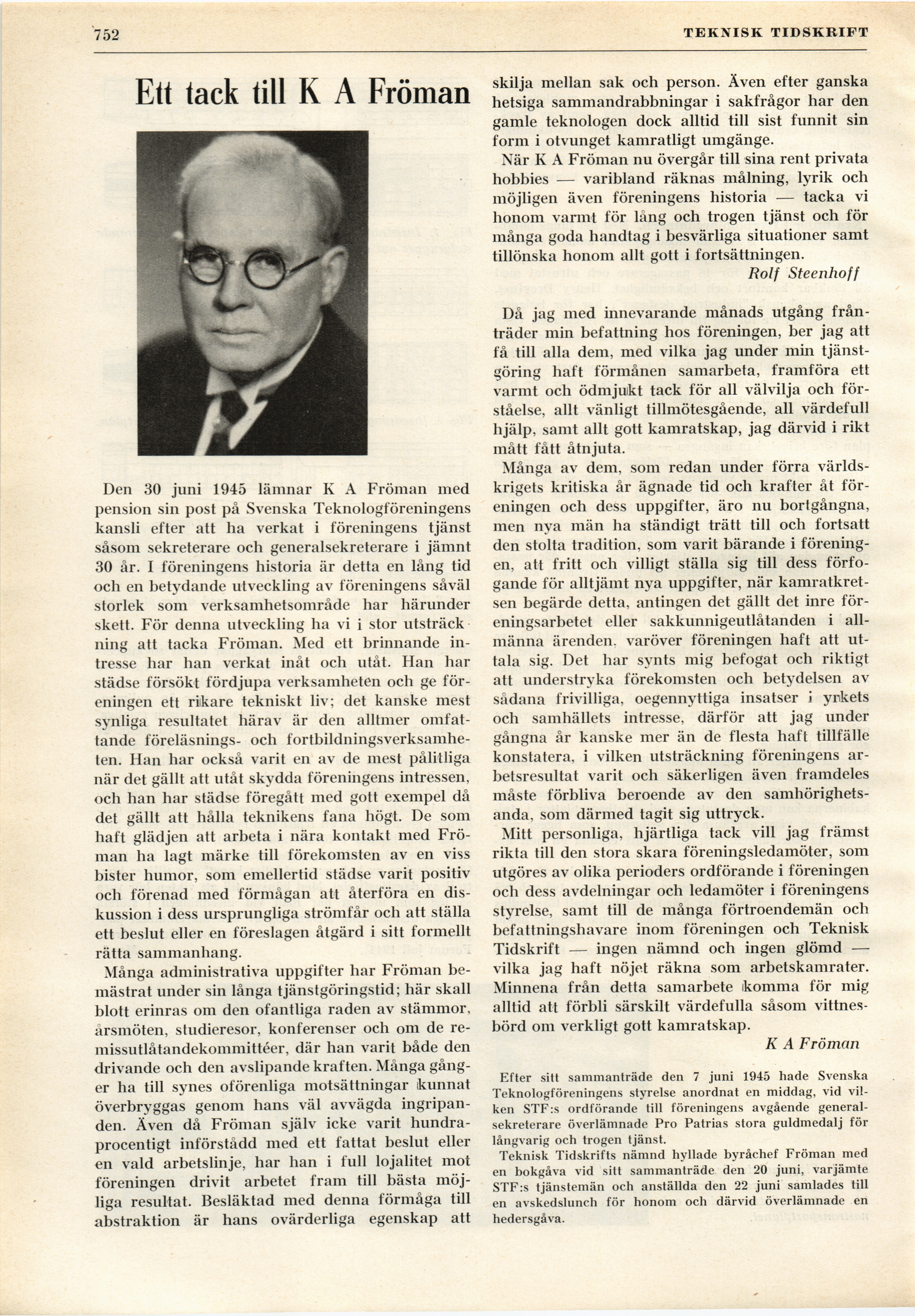 Teknisk Tidskrifts nämnd hyllade byråchef Fröman med