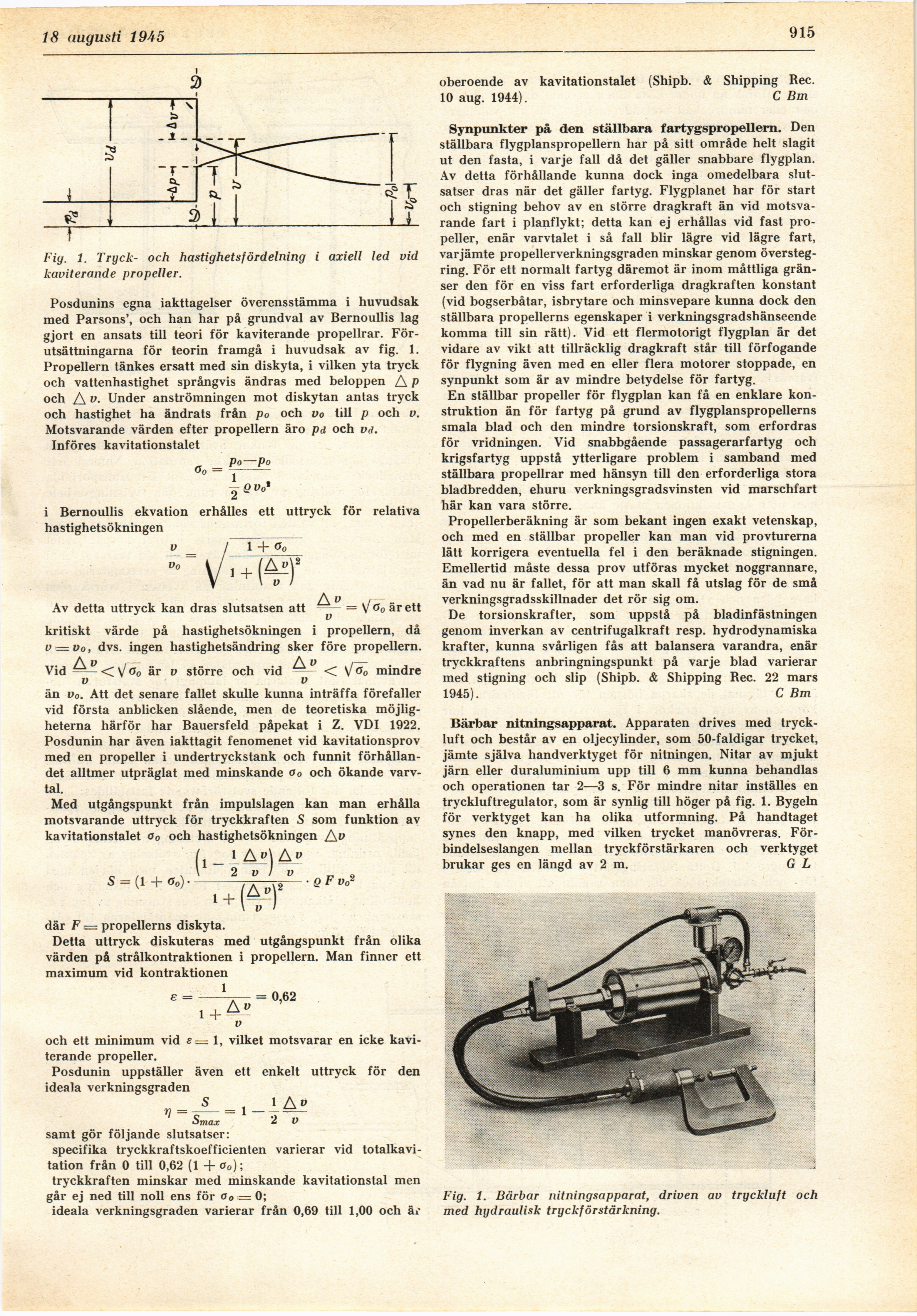 Full resolution (JPEG) - On this page / på denna sida - H. 33. 18 augusti 1945 - Totalkaviterande propellrar, av C Bm - Synpunkter på den ställbara fartygspropellern, av C Bm - Bärbar nitningsapparat, av G L