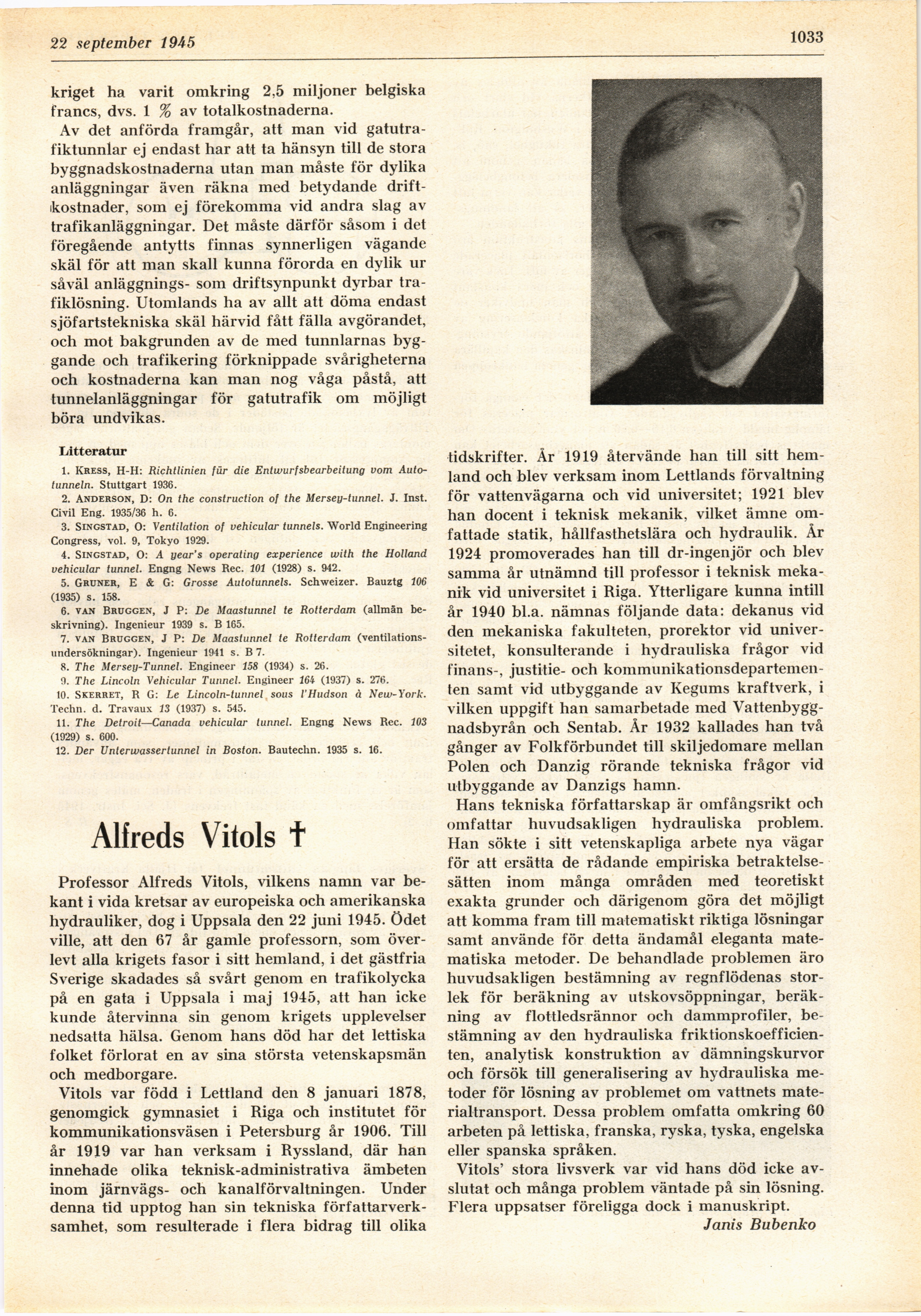 Full resolution (JPEG) - On this page / på denna sida - H. 38. 22 september 1945 - Utländska tunnlar för gatutrafik, av Stig Samuelson och Kurt Pålsson - Alfreds Vitols †, av Janis Bubenko