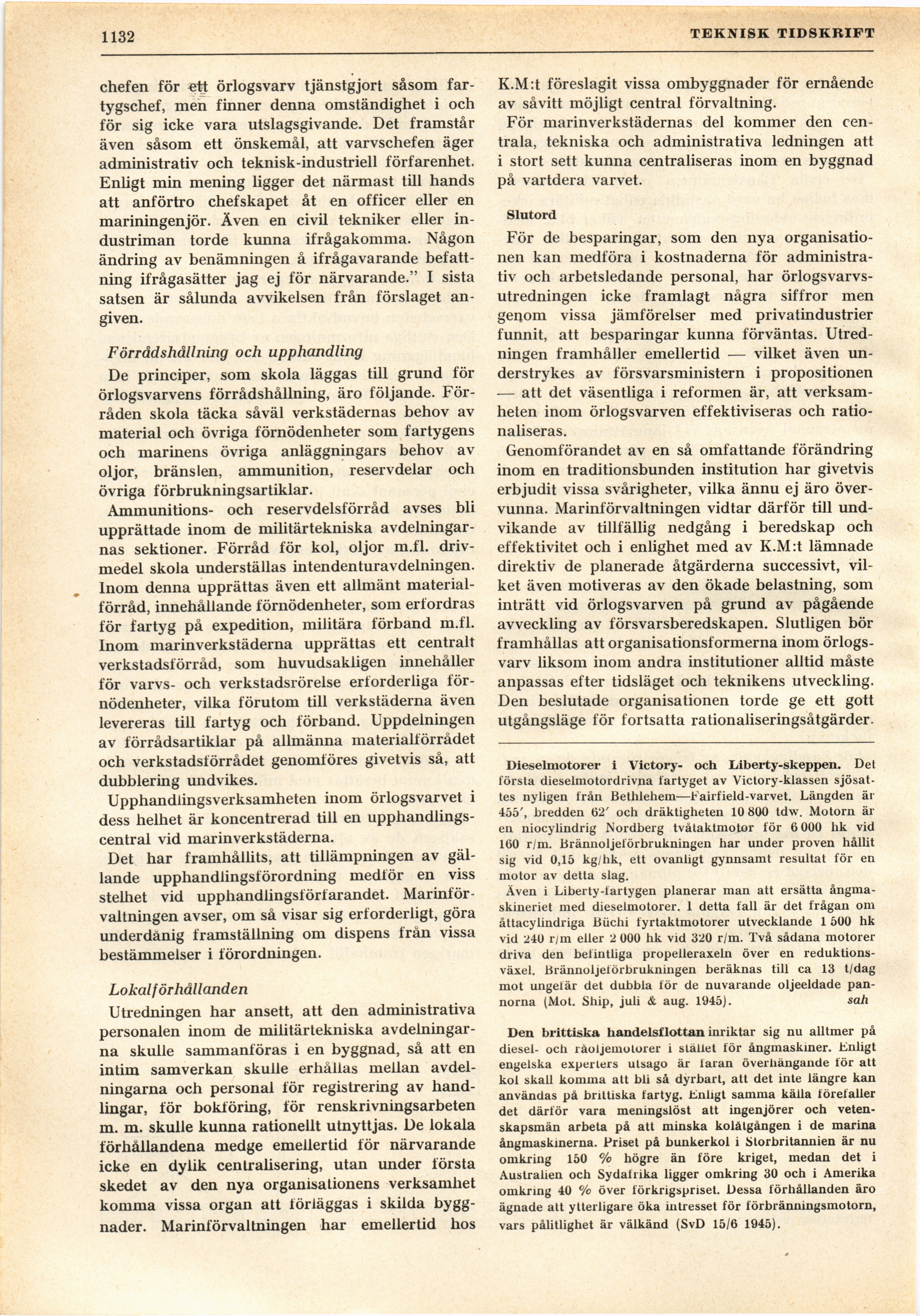 Full resolution (JPEG) - On this page / på denna sida - H. 42. 20 oktober 1945 - Marinens nya varvsorganisation, av Harald Qvistgaard - Dieselmotorer i Victory- och Liberty-skeppen, av sah - Den brittiska handelsflottan