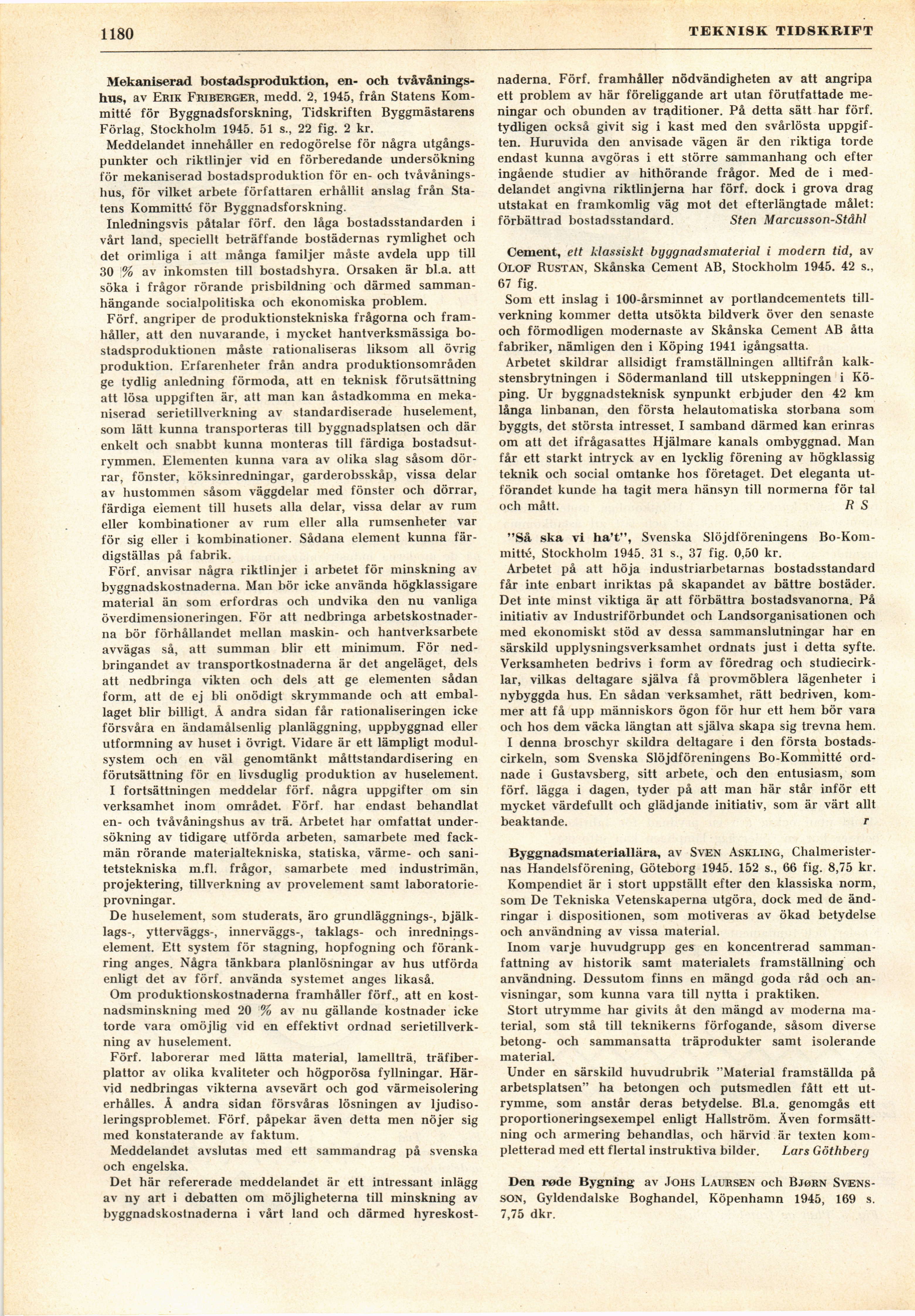 Full resolution (JPEG) - On this page / på denna sida - H. 43. 27 oktober 1945 - Mekaniserad bostadsproduktion, en- och tvåvånungshus, av Sten Marcusson-Ståhl - Cement, av R S - »Så ska vi ha't», av r - Byggnadsmateriallära, av Lars Göthberg - Den røde Bygning, av Richard Smedberg