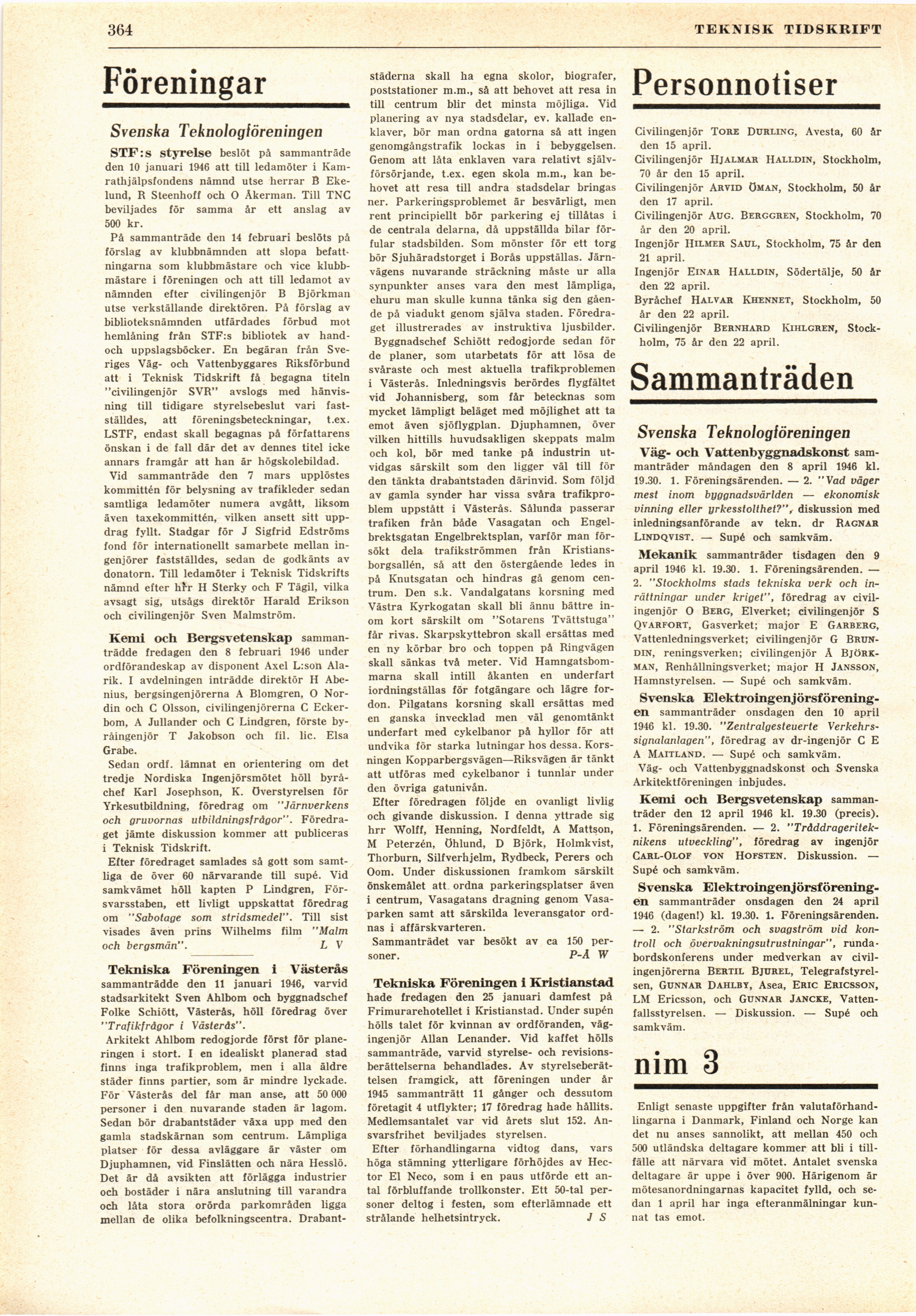Full resolution (JPEG) - On this page / på denna sida - H. 14. 6 april 1946 - Föreningar - Svenska Teknologföreningen. STF:s styrelse - Kemi och Bergsvetenskap, av L V - Tekniska Föreningen i Västerås, av P-Å W - Tekniska Föreningen i Kristianstad, av J S - Personnotiser - Sammanträden - nim 3