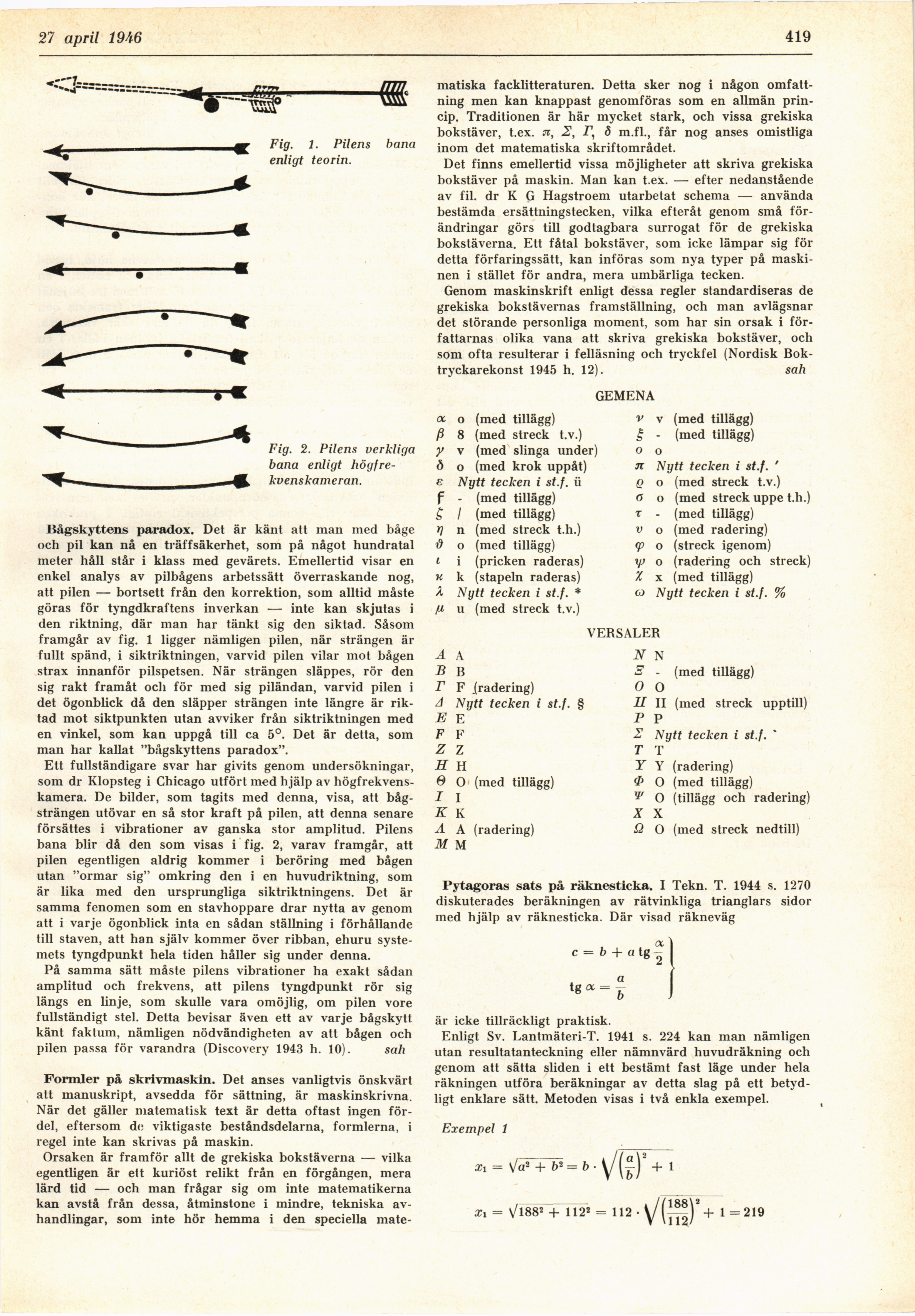 Full resolution (JPEG) - On this page / på denna sida - H. 17. 27 april 1946 - Bågskyttens paradox, av sah - Formler på skrivmaskin - Pytagoras sats på räknesticka, av Bengt Jakobsson