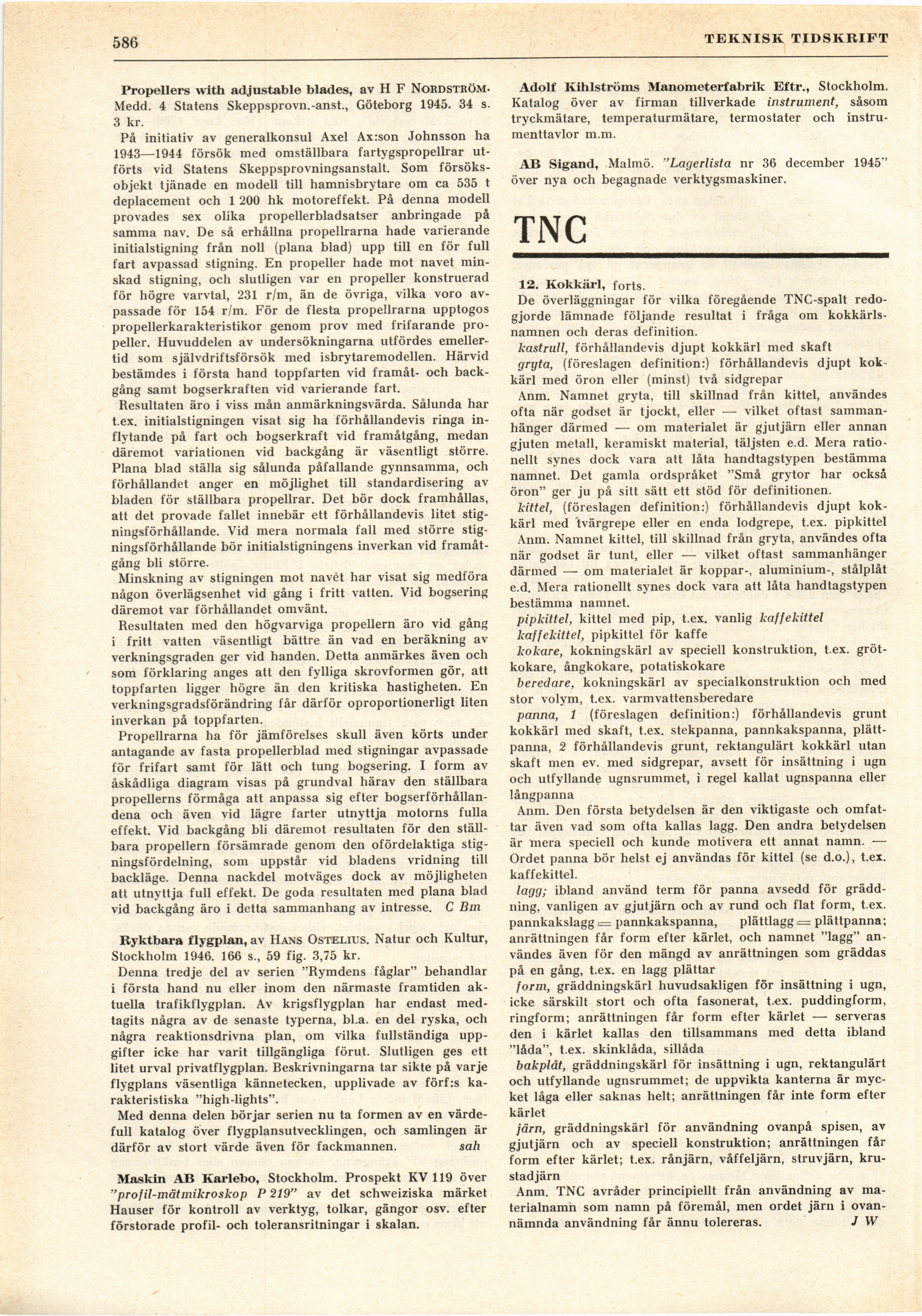 Full resolution (JPEG) - On this page / på denna sida - H. 24. 15 juni 1946 - Propellers with adjustable blades, av C Bm - Ryktbara flygplan, av sah - Maskin AB Karlebo - Adolf Kihlströms Manometerfabrik Eftr. - AB Sigand - TNC: 12. Kokkärl, forts., av J W