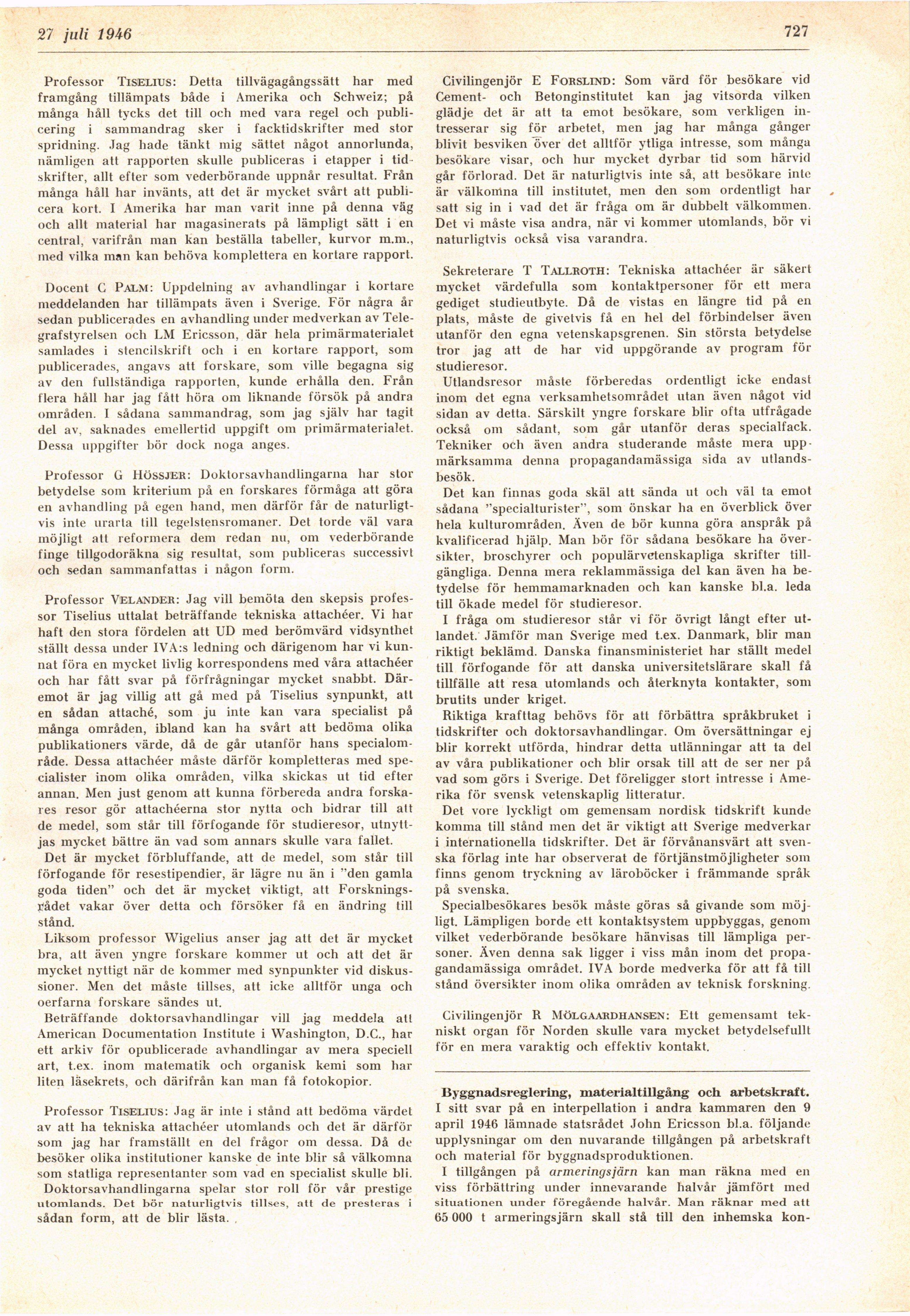 Full resolution (JPEG) - On this page / på denna sida - H. 30. 27 juli 1946 - Intensifiering av våra utlandsförbindelser inom teknisk och vetenskaplig forskning. Diskussion, av W Fellenius, W Borgquist, E Wigelius, E C Jahn, G Wästlund, S Mörtsell, Arne Tiselius, C Palm, G Hössjer, Edy Velander, E Forslind, T Tallroth, R Mölgaardhansen - Byggnadsreglering, materialtillgång och arbetskraft, av r