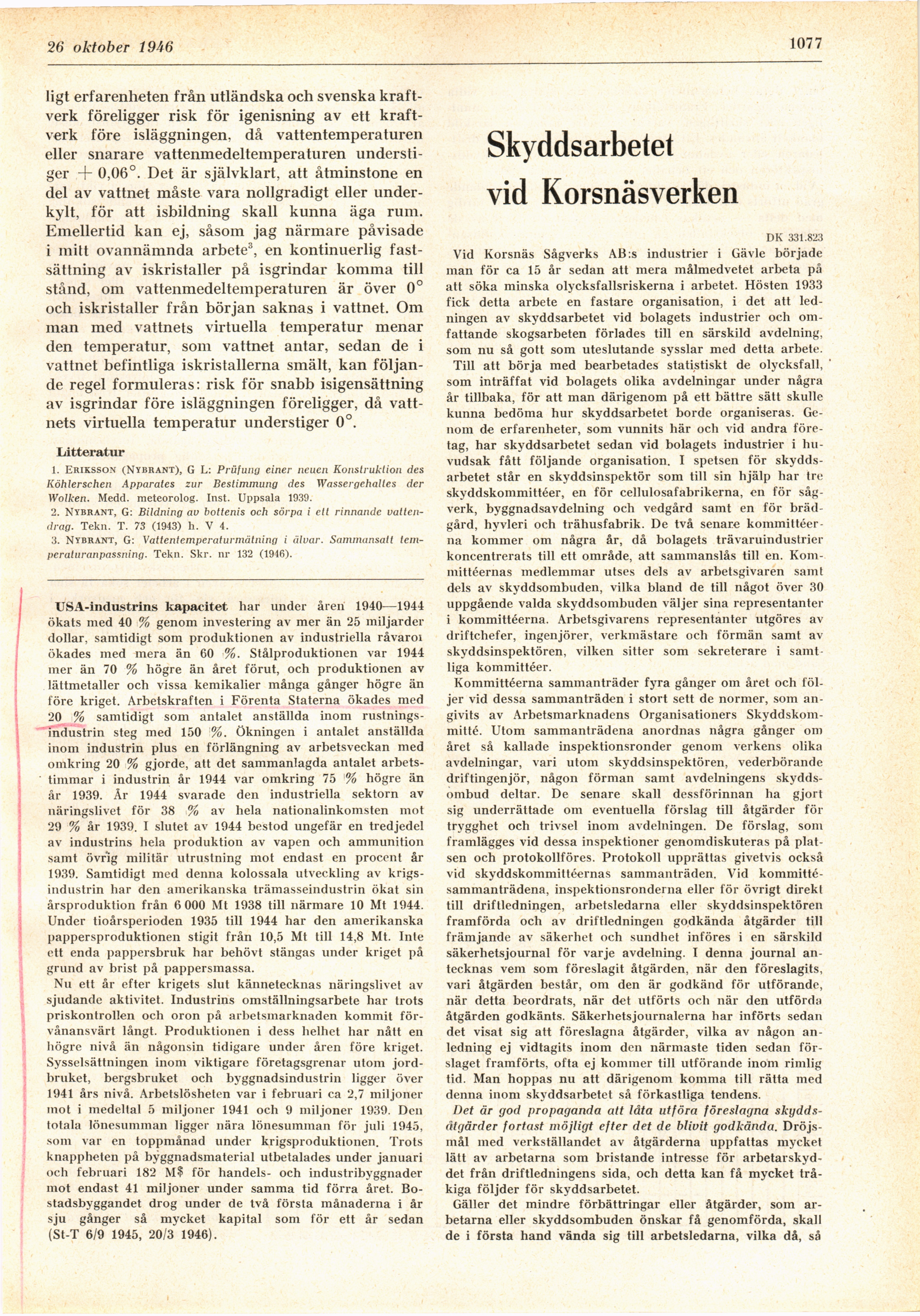 Full resolution (JPEG) - On this page / på denna sida - H. 43. 26 oktober 1946 - Bestämning av vattentemperaturen i älvar, av Gunnar Nybrant - USA-industrins kapacitet - Skyddsarbetet vid Korsnäsverken, av Yngve Christiernsson