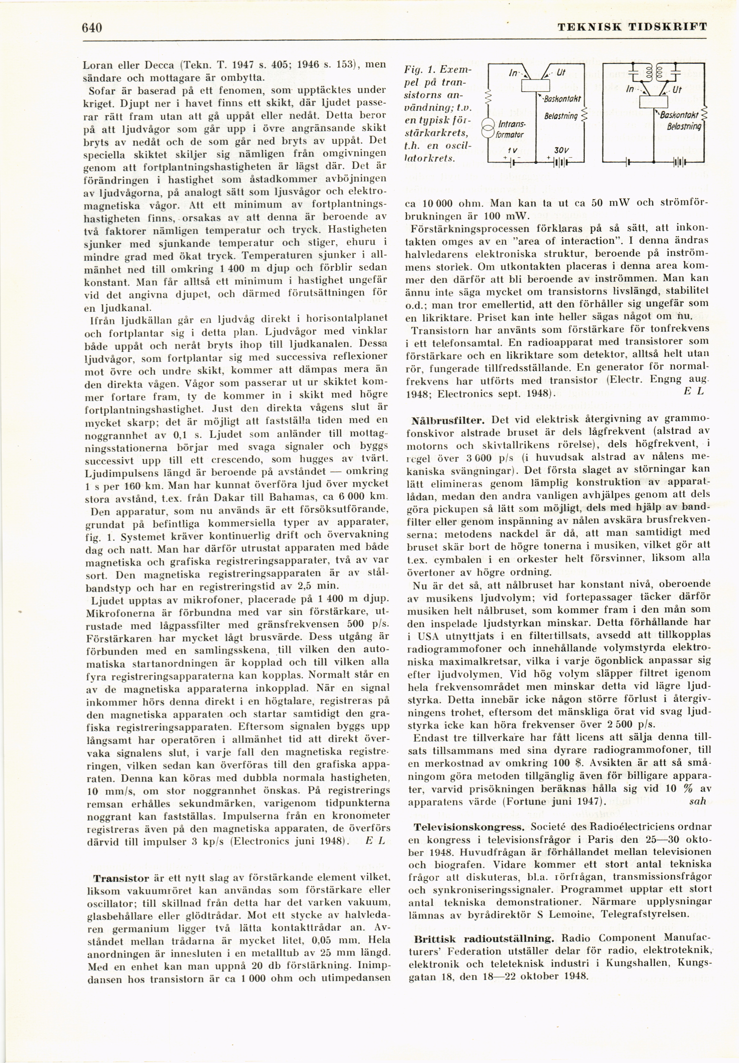 Full resolution (JPEG) - On this page / på denna sida - H. 36. 2 oktober 1948 - Sofar, av E L - Transistor, av E L - Nålbrusfilter, av sah - Televisionskongress - Brittisk radioutställning