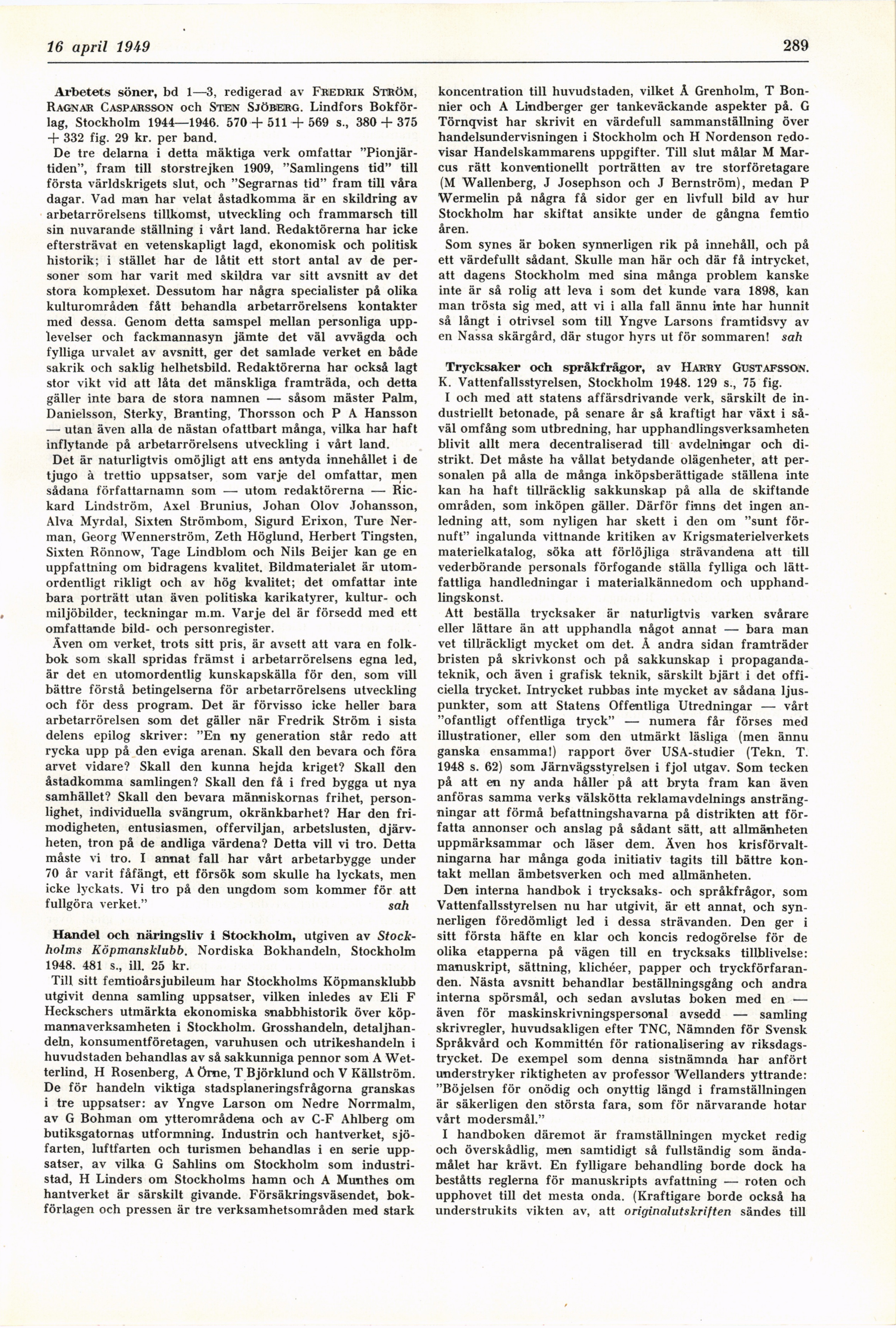 Full resolution (JPEG) - On this page / på denna sida - H. 16. 16 april 1949 - Anmälan: Arbetets söner, av sah - Anmälan: Handel och näringsliv i Stockholm, av sah - Anmälan: Trycksaker och språkfrågor, av sah