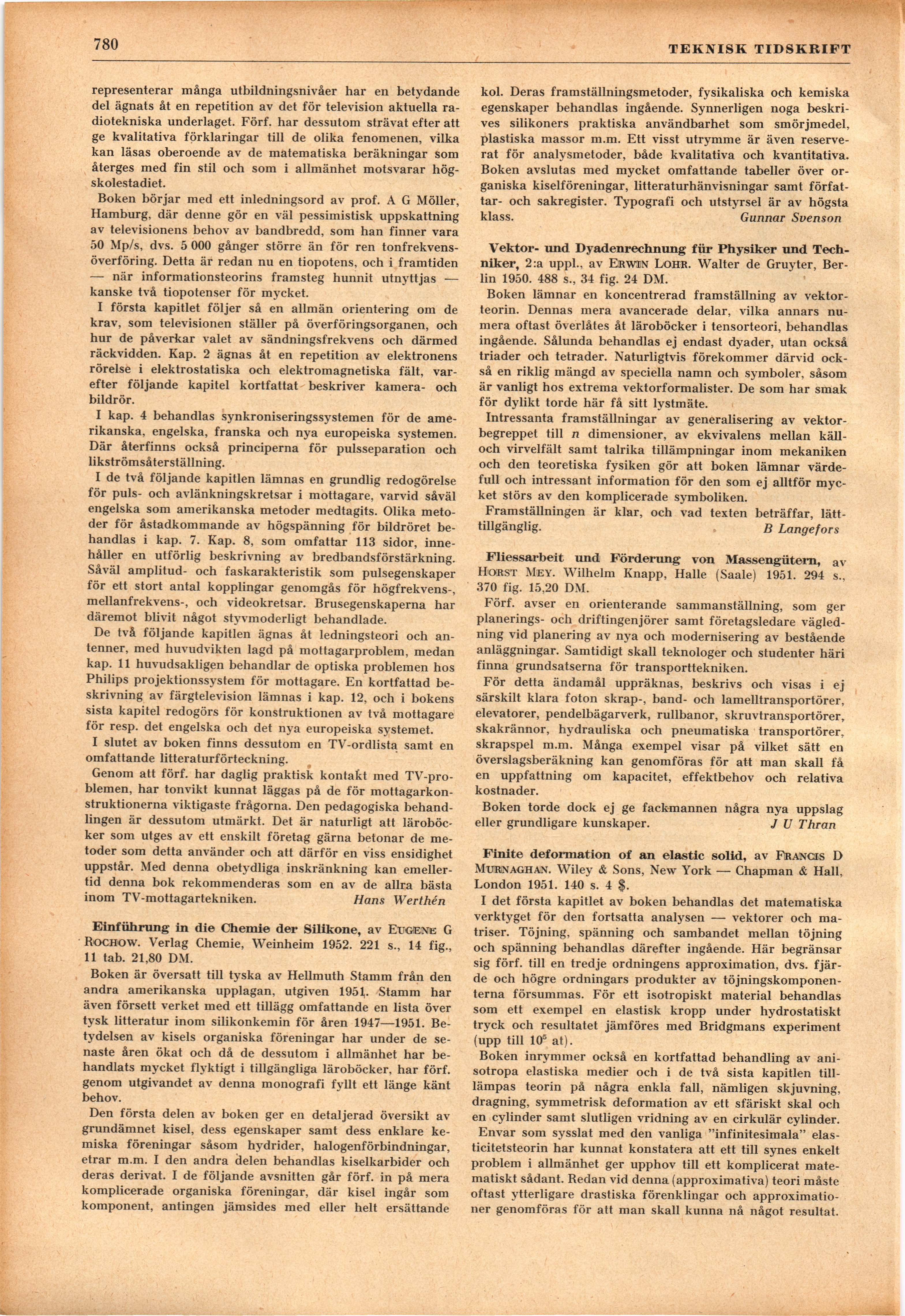 Full resolution (JPEG) - On this page / på denna sida - H. 34. 23 september 1952 - Böcker - Fernsehen, av Hans Werthén - Einführung in die Chemie der Silikone, av Gunnar Svenson - Vektor- und Dyadenrechnung für Physiker und Techniker, av B Langefors - Fliessarbeit und Fördreung von Massengütern, av J U Thran - Finite deformation of an elastic solid, av Frithiof Niordson