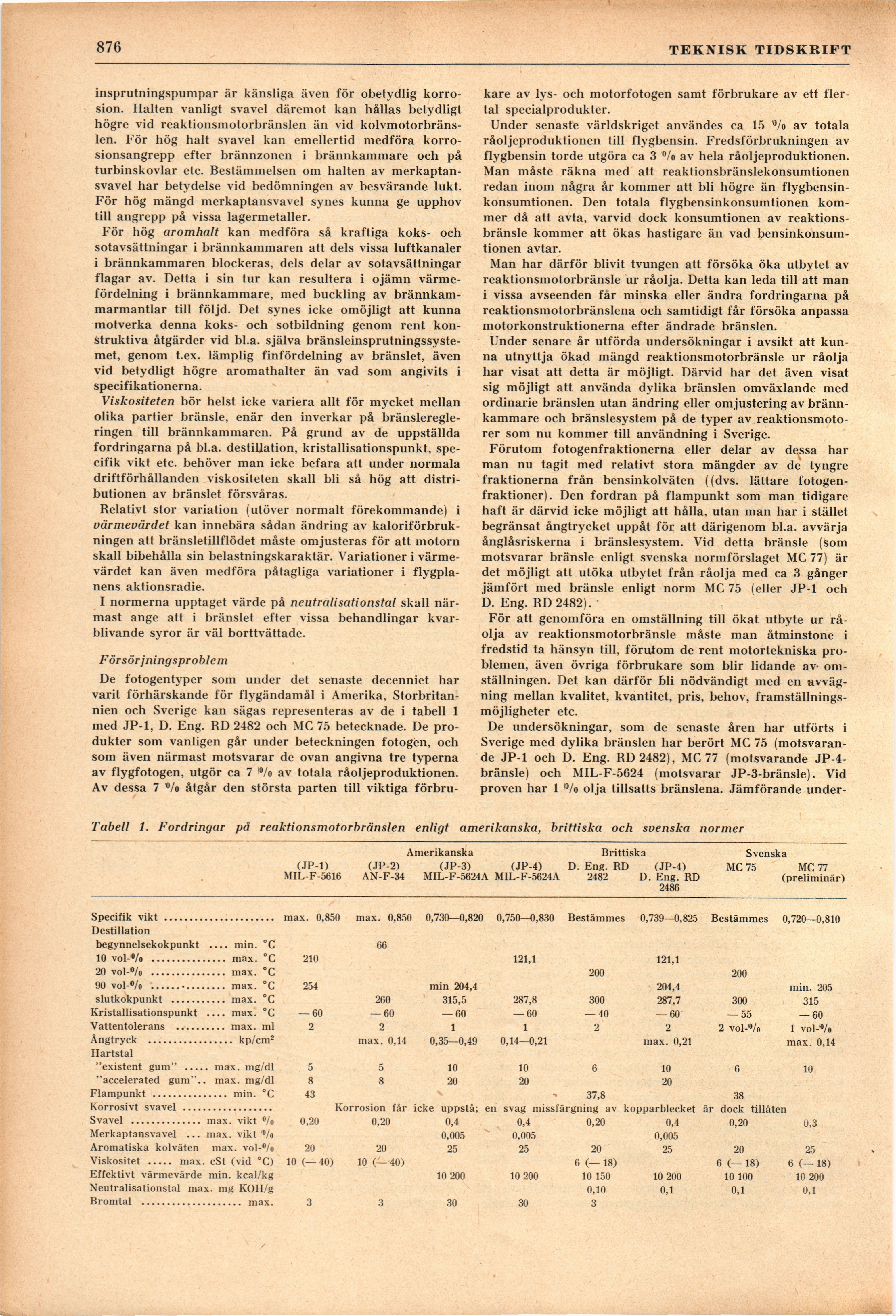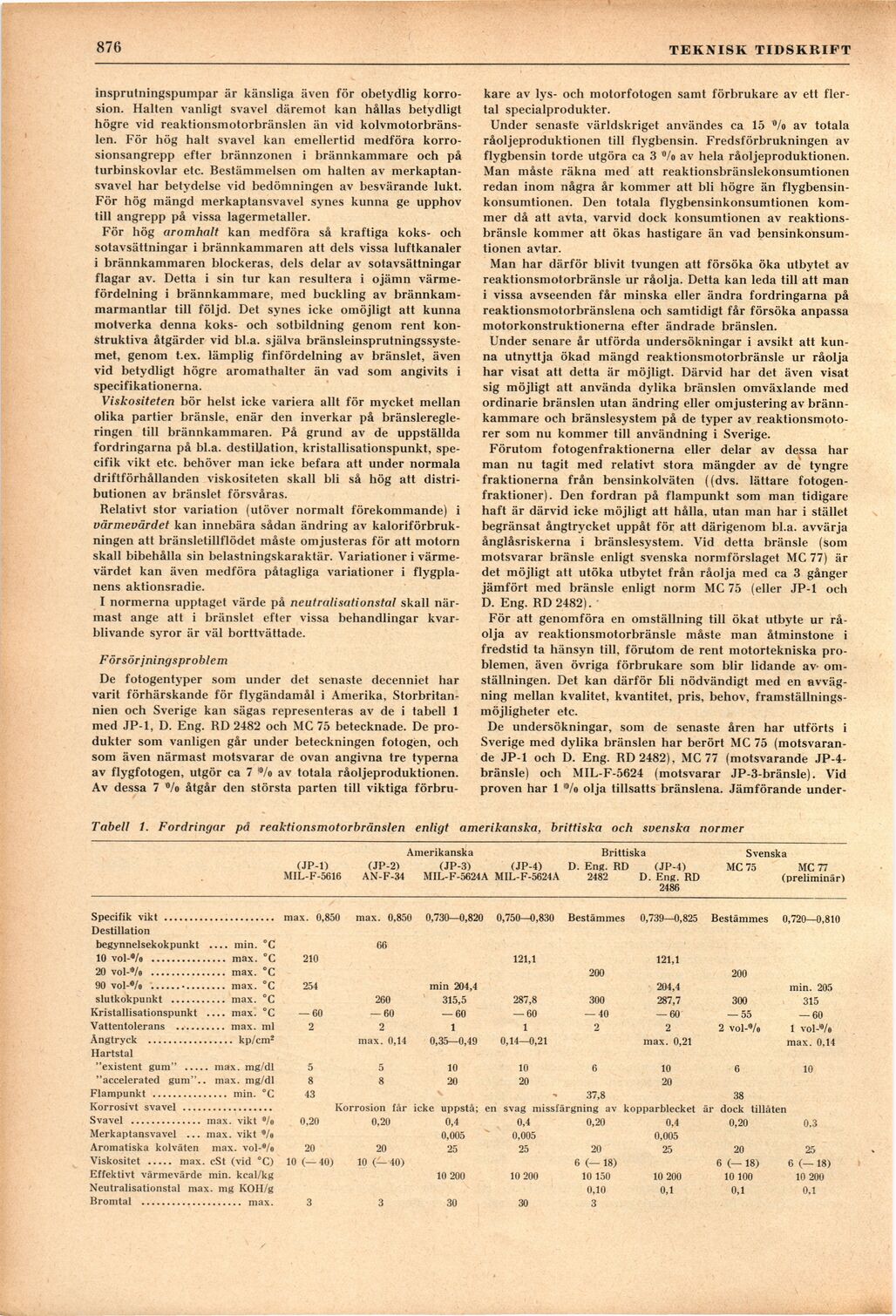 Tabell 1. Fordringar på reaktionsmotorbränslen enligt amerikanska, brittiska och svenska normer