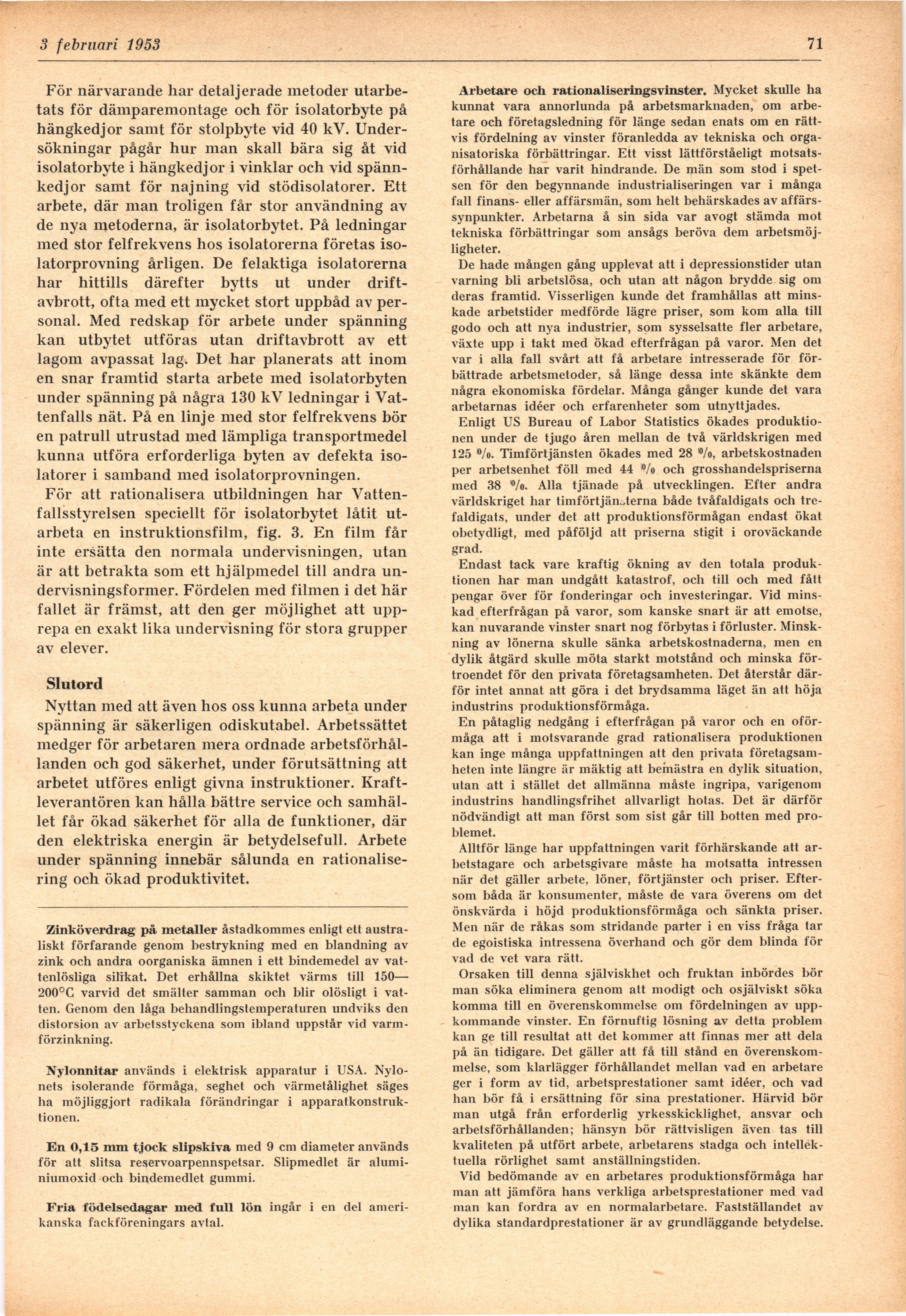 Full resolution (JPEG) - On this page / på denna sida - H. 5. 3 februari 1953 - Arbeten på spänningsförande ledningar, av David Zetterholm - Zinköverdrag på metaller - Nylonnitar - En 0,15 mm tjock slipskiva - Fria födelsedagar med full lön - Arbetare och rationaliseringsvinster, av Pg
