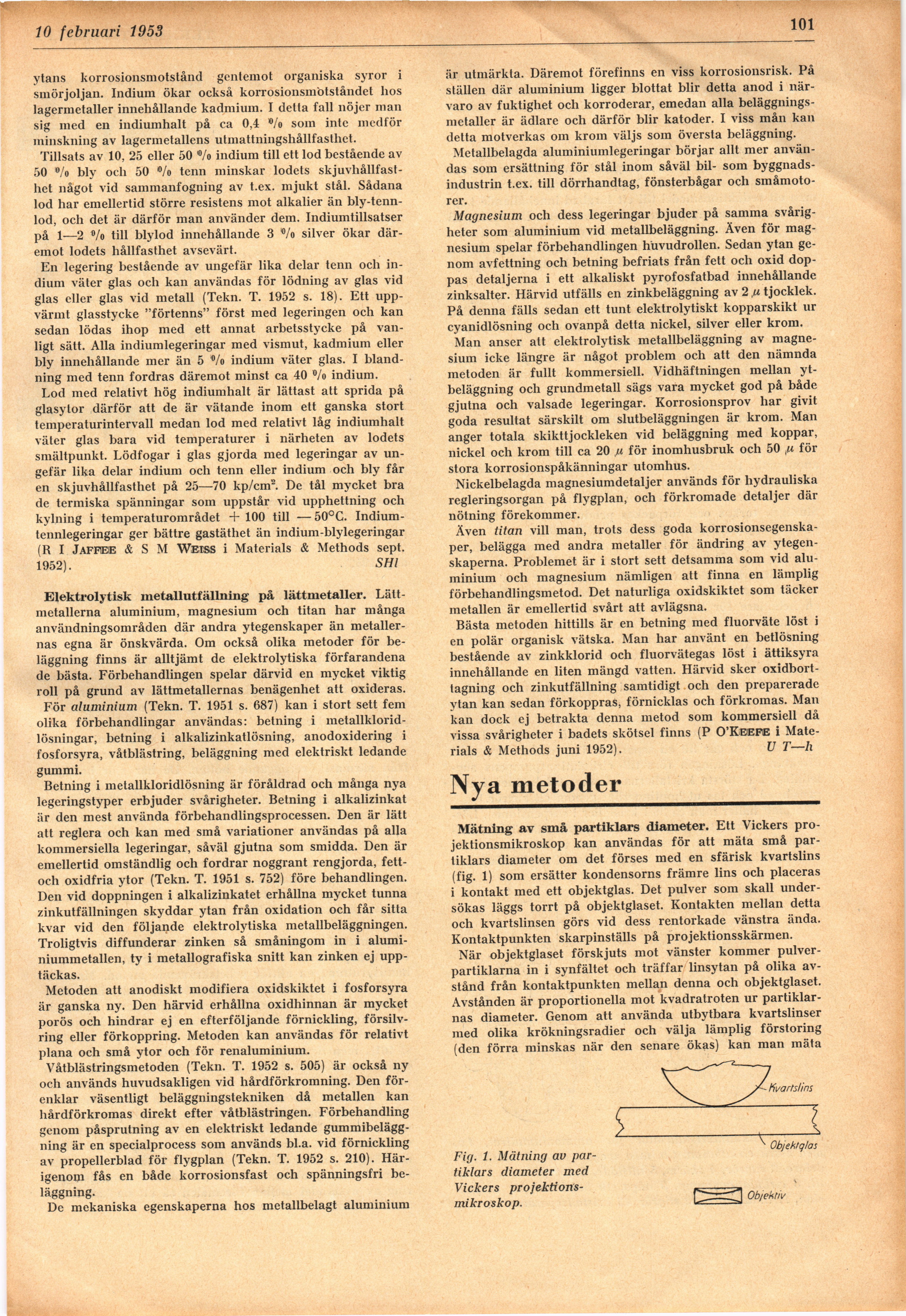 Full resolution (JPEG) - On this page / på denna sida - H. 6. 10 februari 1953 - Andras erfarenheter - Användning av indiumlegeringar, av SHl - Elektrolytisk metallutfällning på lättmetaller, av U T—h - Nya metoder - Mätning av små partiklars diameter, av SHl