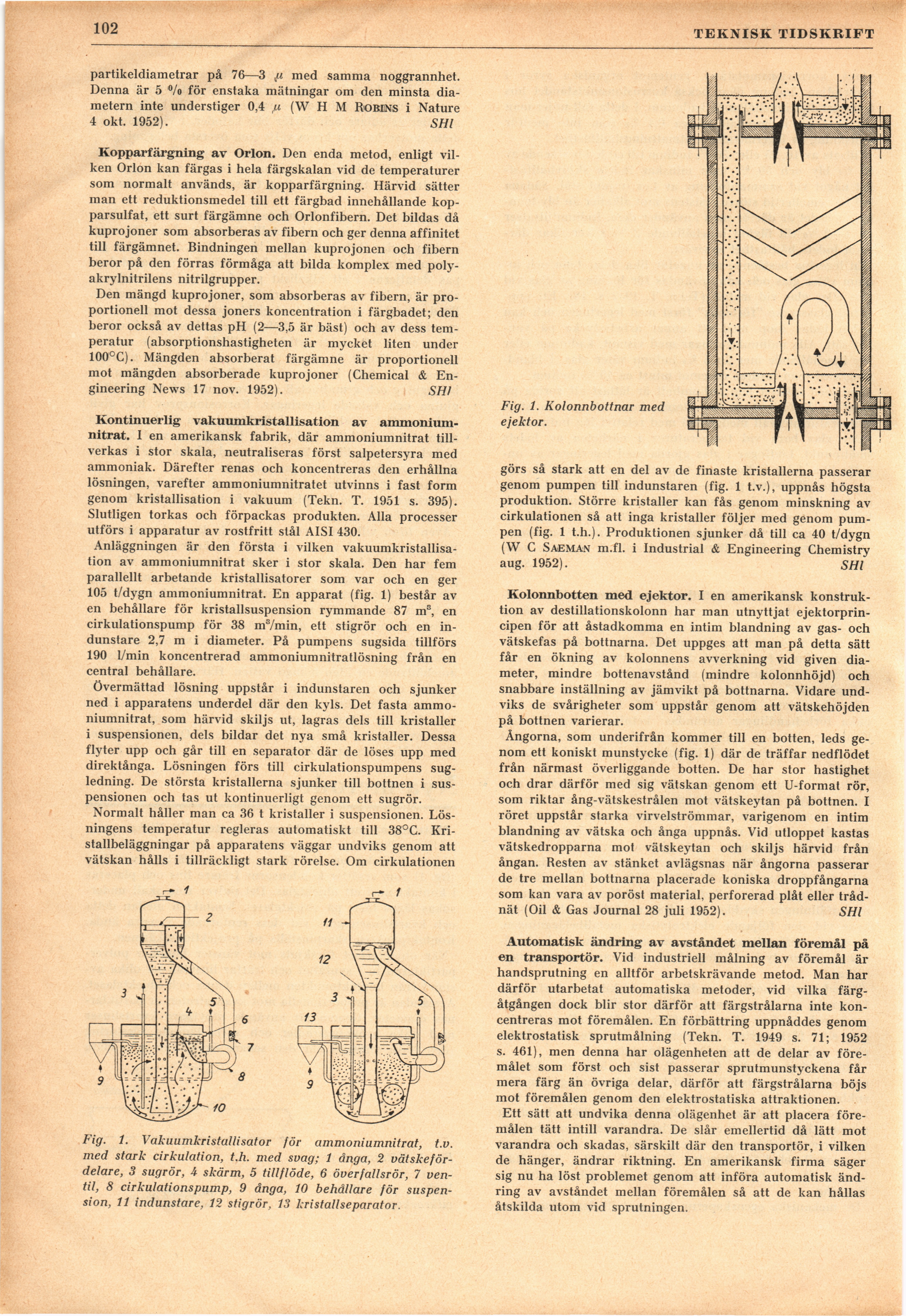 Full resolution (JPEG) - On this page / på denna sida - H. 6. 10 februari 1953 - Nya metoder - Mätning av små partiklars diameter, av SHl - Kopparfärgning av Orlon, av SHl - Kontinuerlig vakuumkristallisation av ammoniumnitrat, av SHl - Kolonnbotten med ejektor, av SHl - Automatisk ändring av avståndet mellan föremål på en transportör, av SHl