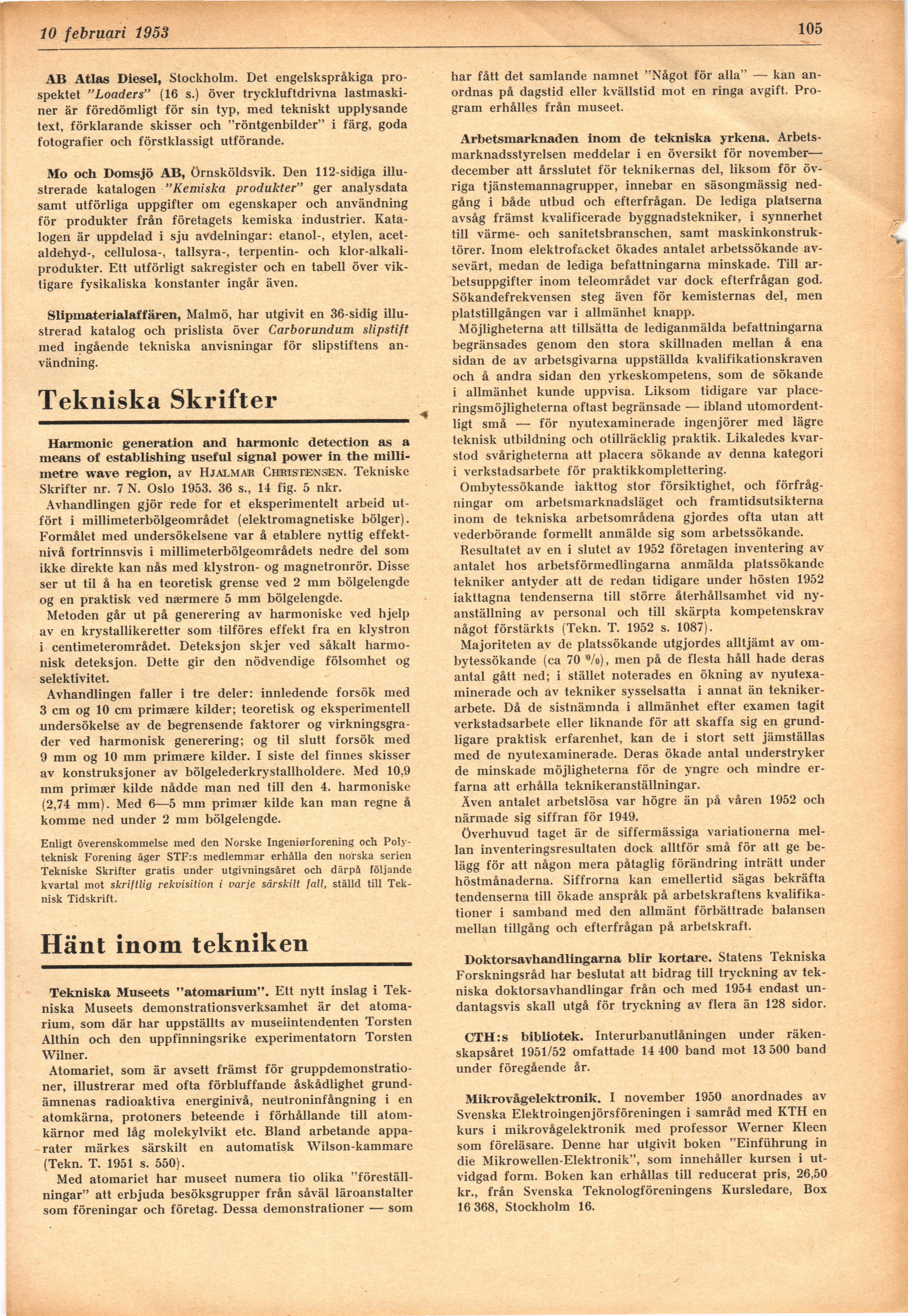 Full resolution (JPEG) - On this page / på denna sida - H. 6. 10 februari 1953 - Böcker - AB Atlas Diesel - Mo och Domsjö AB - Slipmaterialaffären - Tekniska Skrifter: Harmonic generation and harmonic detection as a means of establishing useful signal power in the millimetre wave region - Hänt inom tekniken - Tekniska Museets »atomarium» - Arbetsmarknaden inom de tekniska yrkena - Doktorsavhandlingarna blir kortare - CTH:s bibliotek - Mikrovågselektronik