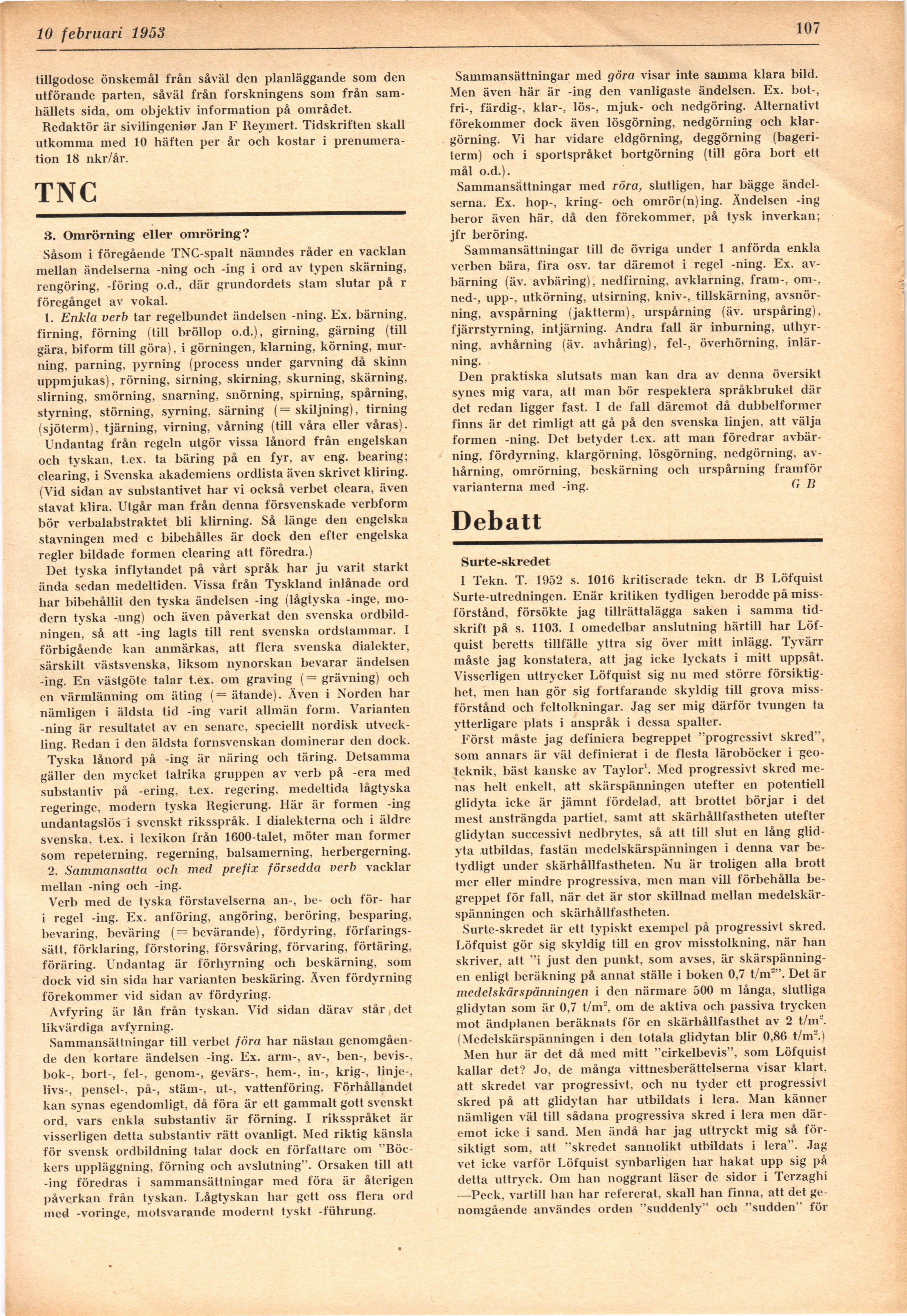 Full resolution (JPEG) - On this page / på denna sida - H. 6. 10 februari 1953 - Hänt inom tekniken - Ny tidskrift - TNC: 3. Omrörning eller omröring? av G B - Debatt: Surte-skredet, av Bernt Jakobson och Bertil Löfquist