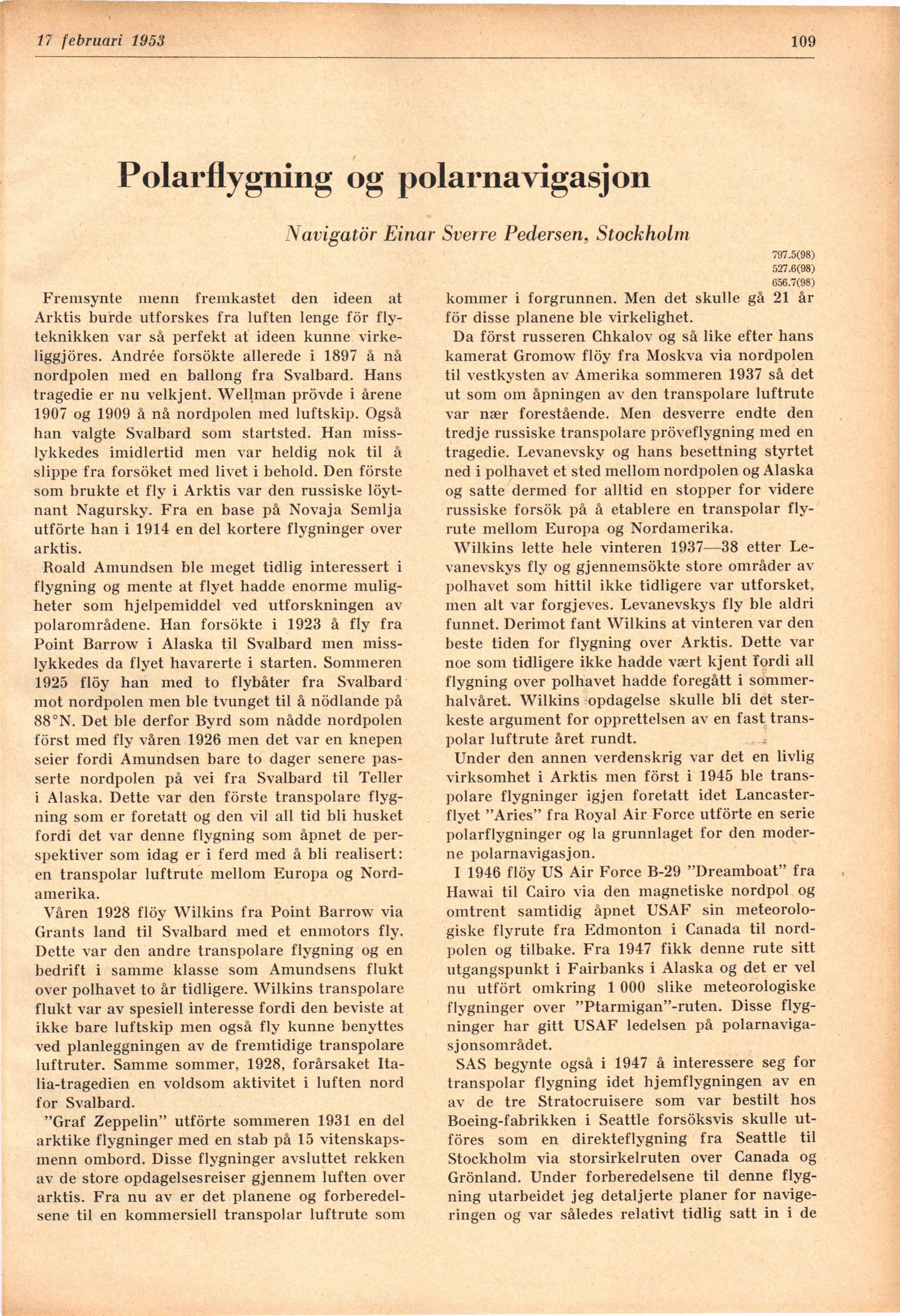 Full resolution (JPEG) - On this page / på denna sida - H. 7. 17 februari 1953 - Polarflygning og polarnavigasjon, av Einar Sverre Pedersen