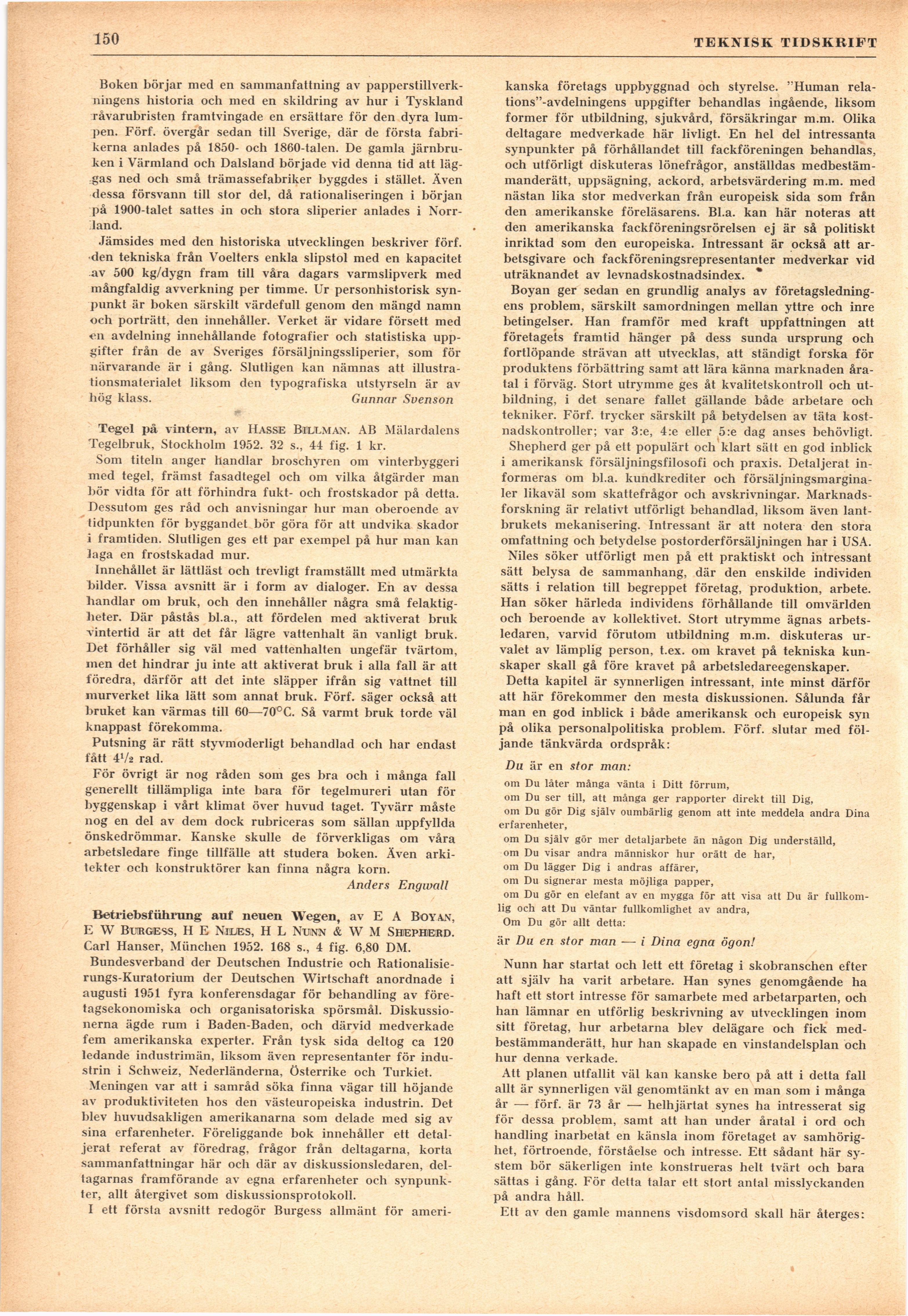 Full resolution (JPEG) - On this page / på denna sida - H. 8. 24 februari 1953 - Böcker - Slipmassaindustriens tekniska utveckling i Sverige 1857—1950, av Gunnar Svenson - Tegel på vintern, av Anders Engwall - Betriebsführung auf neuen Wegen, av Yngve Svensson