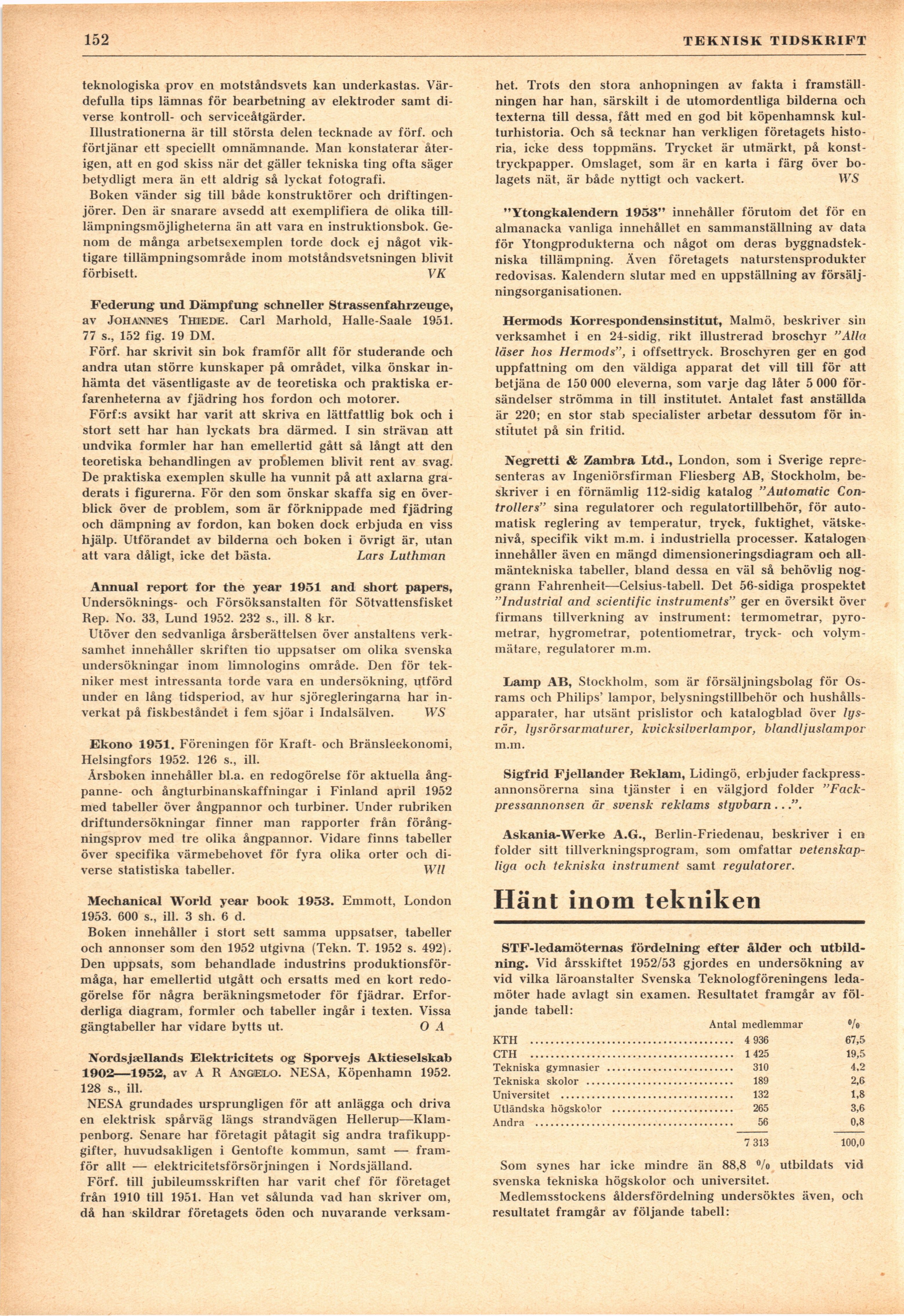 Full resolution (JPEG) - On this page / på denna sida - H. 8. 24 februari 1953 - Böcker - Resistance welding, designing, tooling and applications, av VK - Federung und Dämpfung schneller Strassenfahrzeuge, av Lars Luthman - Annual report for the year 1951 and short papers, av WS - Ekono 1951, av Wll - Mechanical World year book 1953, av O A - Nordsjællands Elektricitets og Sporvejs Aktieselskab 1902—1952, av WS - »Ytongkalendern 1953» - Hermods Korrespondensinstitut - Negretti & Zambra Ltd. - Lamp AB - Sigfrid Fjellander Reklam - Askania-Werke A.G. - Hänt inom tekniken - STF-ledamöternas fördelning efter ålder och utbildning