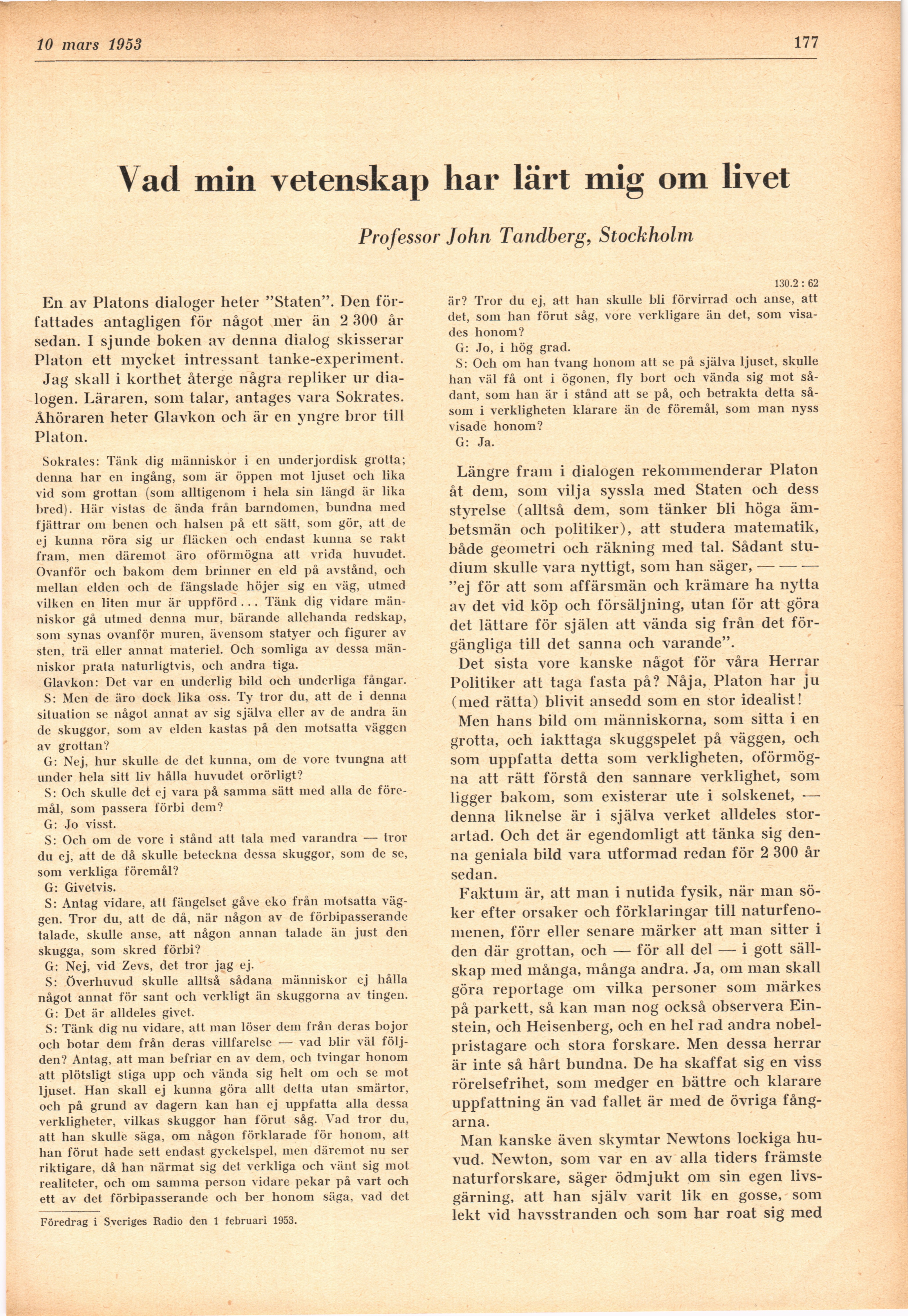 Full resolution (JPEG) - On this page / på denna sida - H. 10. 10 mars 1953 - Vad min vetenskap har lärt mig om livet, av John Tandberg