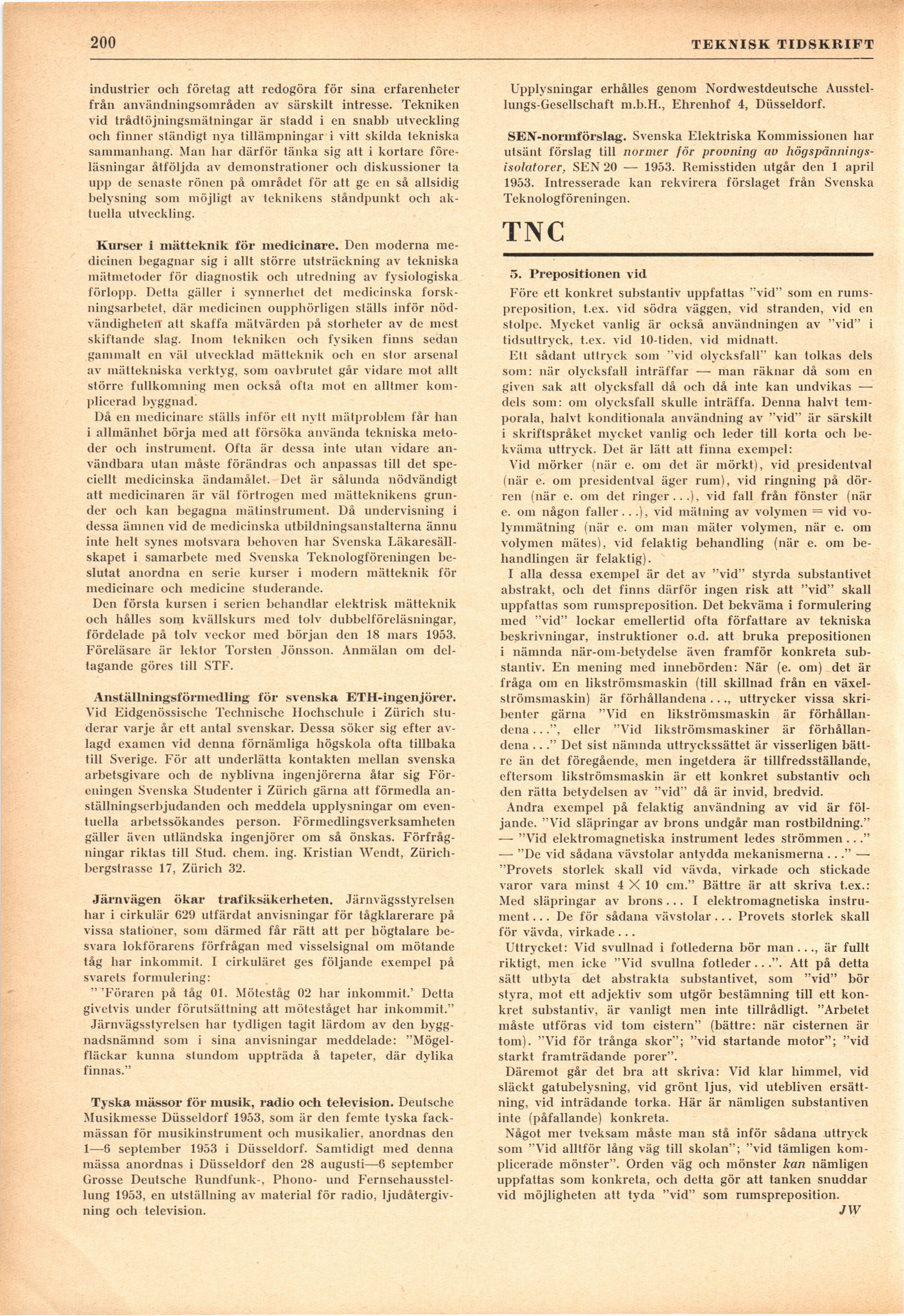 Full resolution (JPEG) - On this page / på denna sida - H. 10. 10 mars 1953 - Hänt inom tekniken - Kurs »Användning av trådtöjningsgivare» - Kurser i mätteknik för medicinare - Anställningsförmedling för svenska ETH-ingenjörer - Järnvägen ökar trafiksäkerheten - Tyska mässor för musik, radio och television - SEN-normförslag - TNC: 5. Prepositionen vid, av JW
