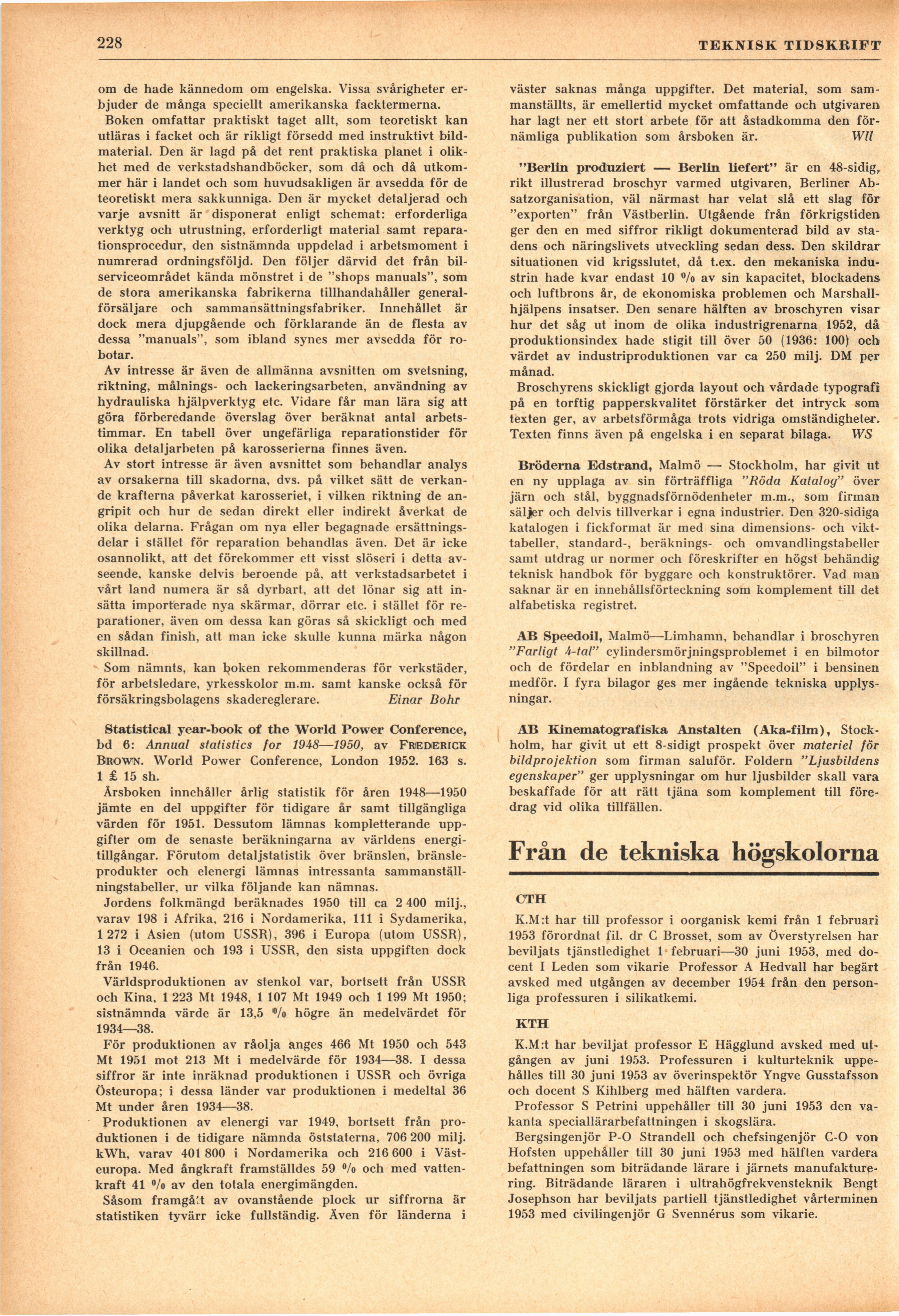 Full resolution (JPEG) - On this page / på denna sida - H. 11. 17 mars 1953 - Böcker - Automobile body reconditioning, av Einar Bohr - Statistical year-book of the World Power Conference, bd 6, av Wll - »Berlin produziert — Berlin liefert», av WS - Bröderna Edstrand - AB Speedoil - AB Kinematografiska Anstalten (Aka-film) - Från de tekniska högskolorna