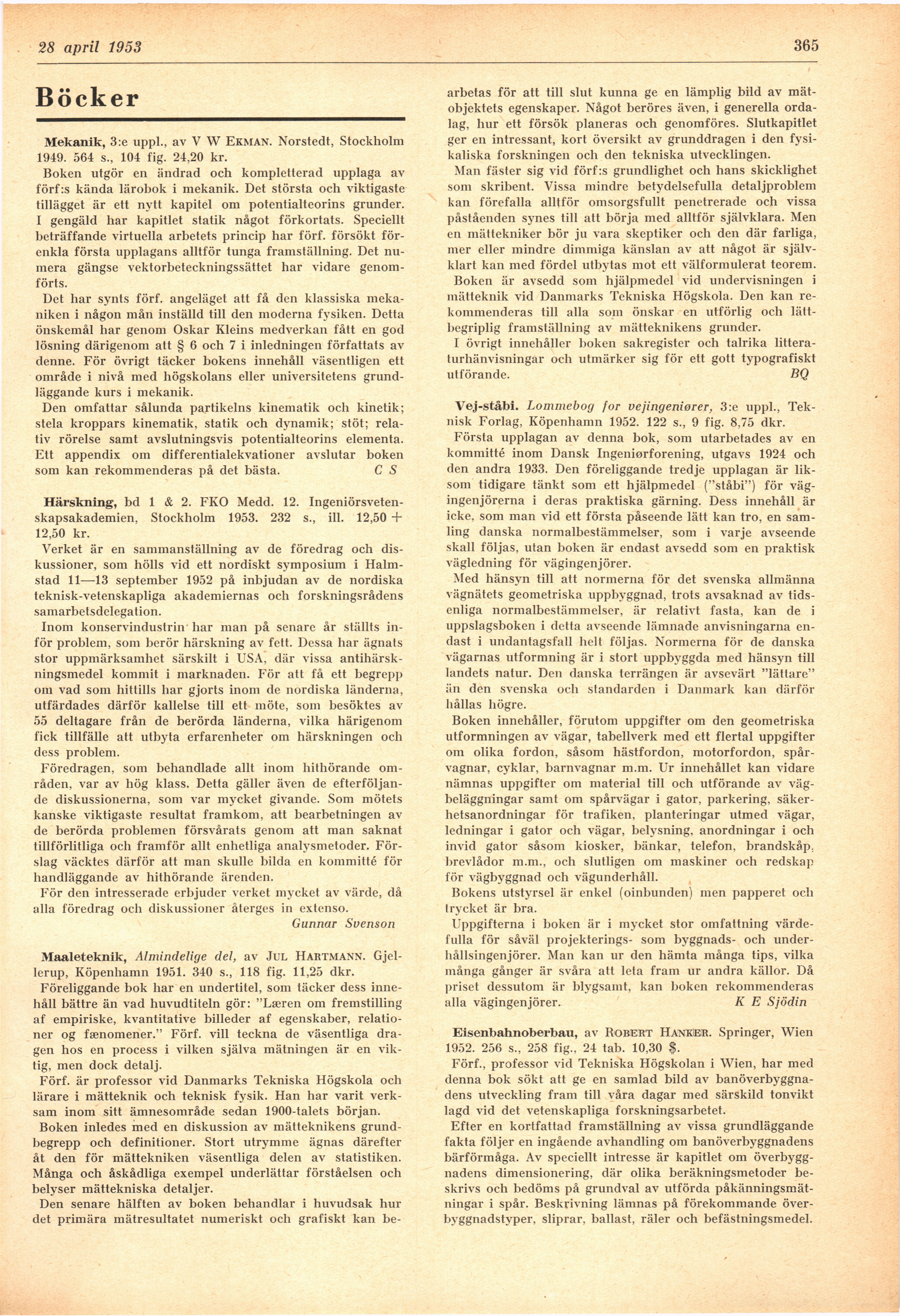Full resolution (JPEG) - On this page / på denna sida - H. 17. 28 april 1953 - Böcker - Mekanik, av C S - Härskning, bd 1 & 2, av Gunnar Svenson - Maaleteknik, av BQ - Vej-ståbi, av K E Sjödin - Eisenbahnoberbau, av S E Schäder