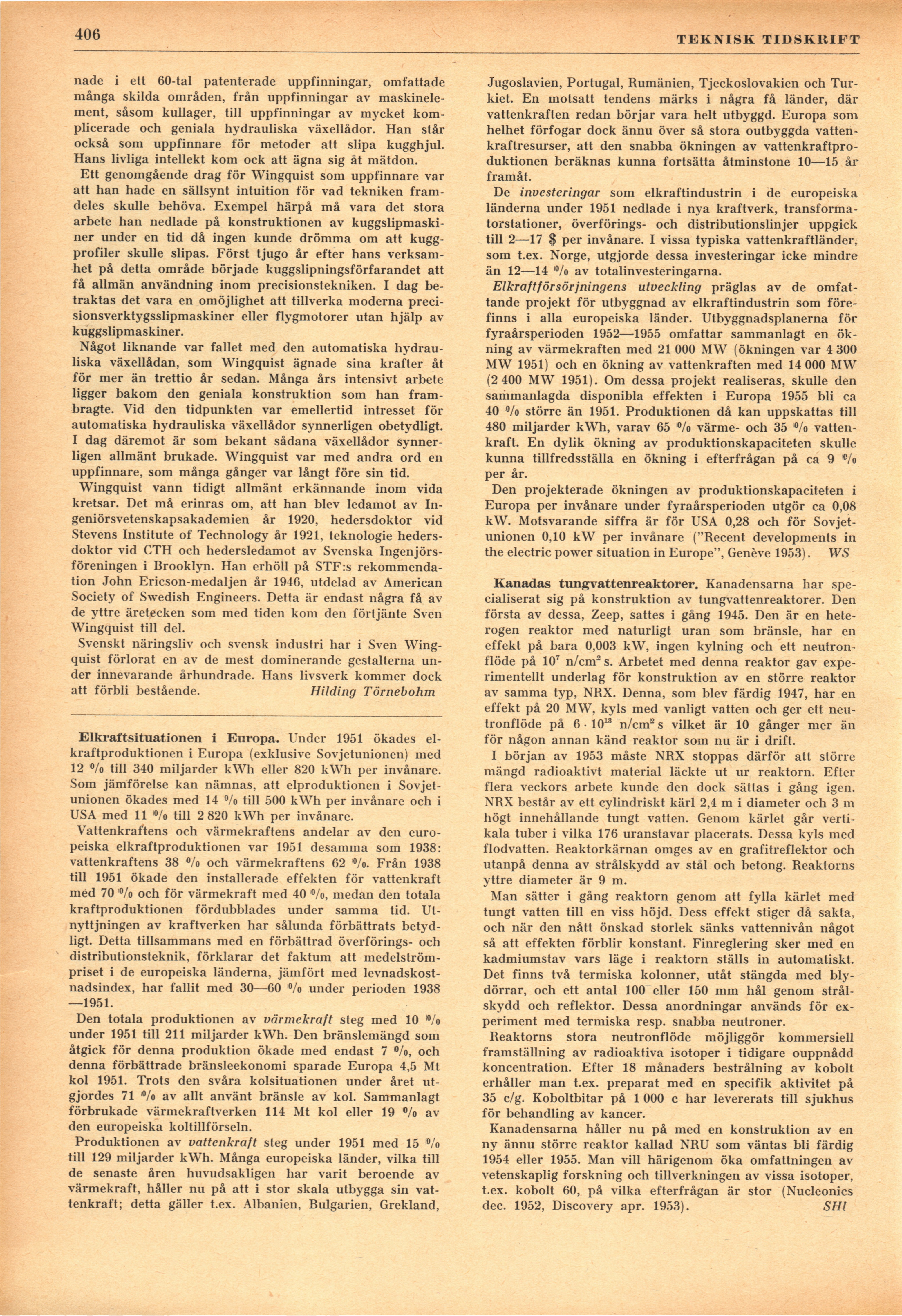 Full resolution (JPEG) - On this page / på denna sida - H. 19. 12 maj 1953 - Sven Wingquist †, av Hilding Törnebohm - Elkraftsituationen i Europa, av WS - Kanadas tungvattenreaktorer, av SHl