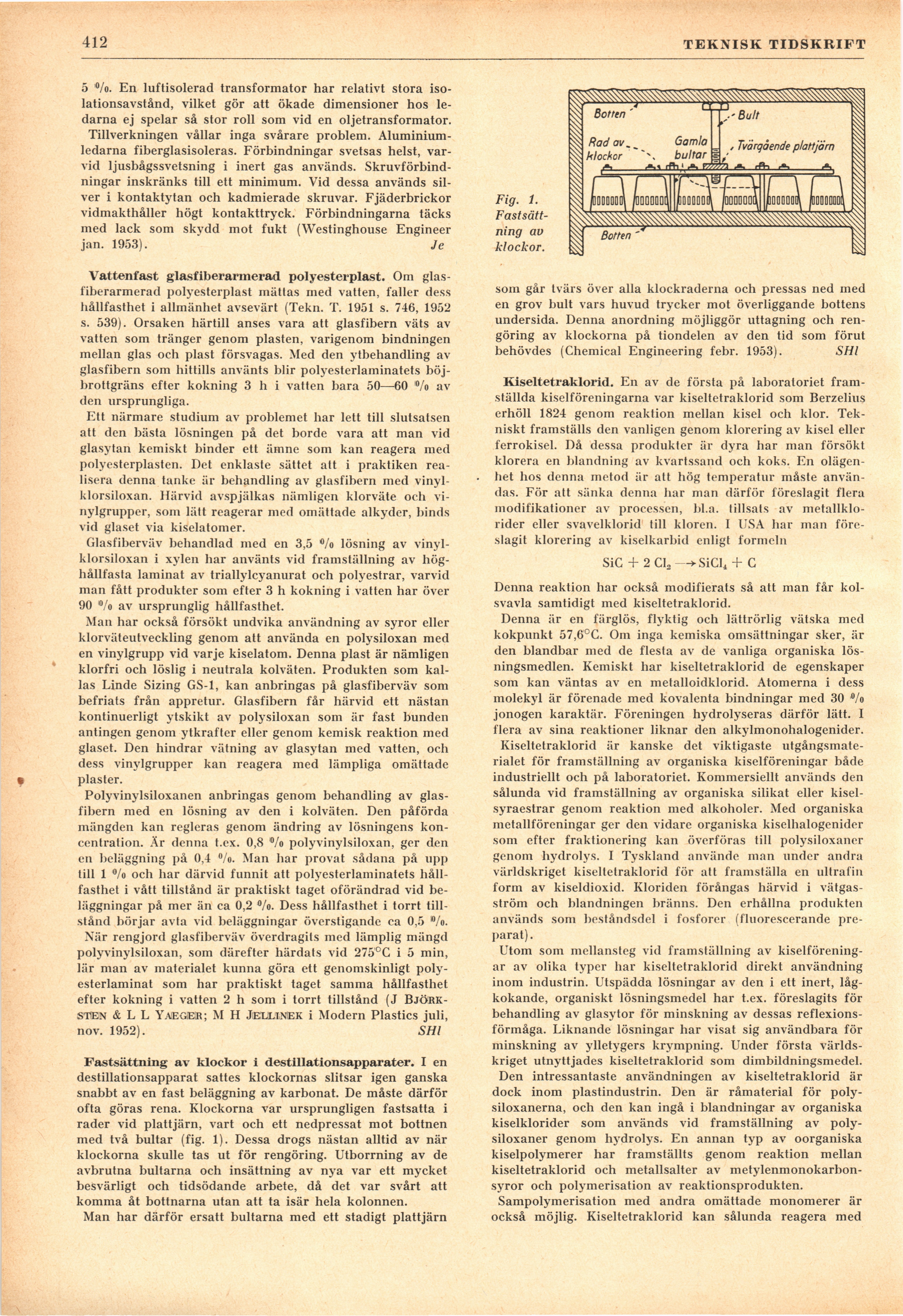 Full resolution (JPEG) - On this page / på denna sida - H. 19. 12 maj 1953 - Andras erfarenheter - Aluminiumlindningar i reaktorer och transformatorer, av Je - Vattenfast glasfiberarmerad polyesterplast, av SHl - Fastsättning av klockor i destillationsapparater, av SHl - Kiseltetraklorid, av SHl