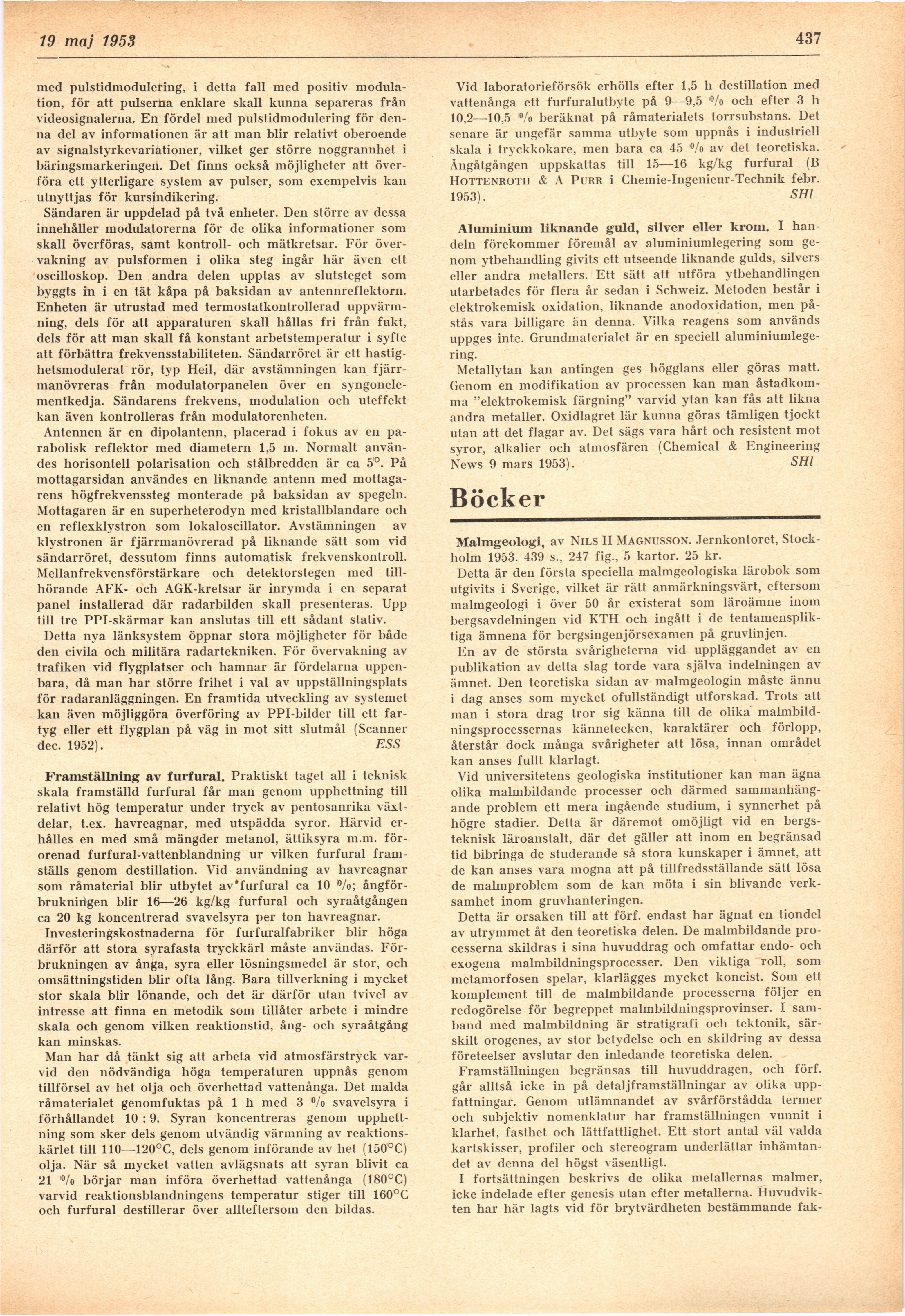 Full resolution (JPEG) - On this page / på denna sida - H. 20. 19 maj 1953 - Nya metoder - Radiolänk för överföring av PPI-bilder, av ESS - Framställning av furfural, av SHl - Aluminium liknande guld, silver eller krom, av SHl - Böcker - Malmgeologi, av E R—s