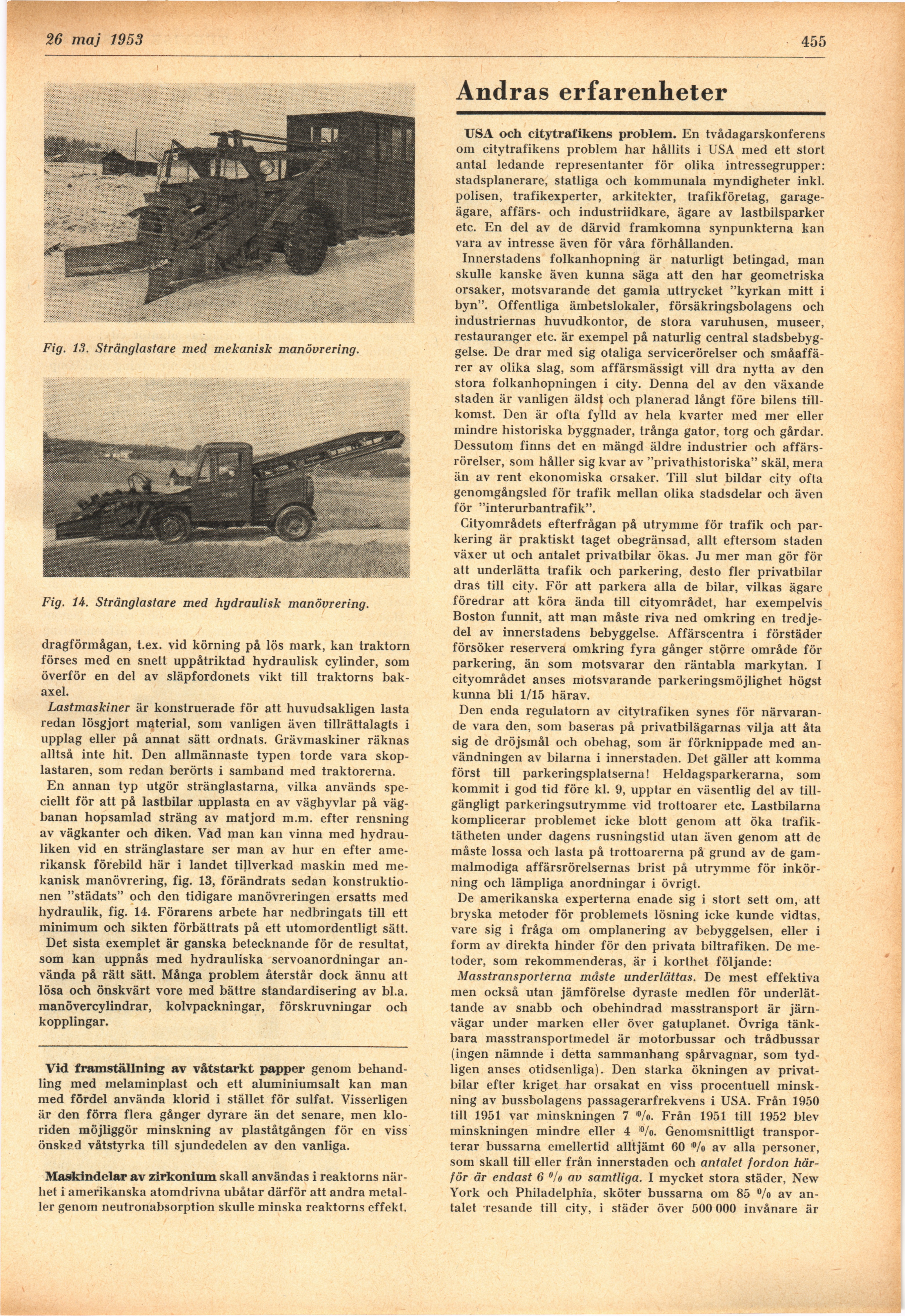 Full resolution (JPEG) - On this page / på denna sida - H. 21. 26 maj 1953 - Hydrauliska servo- och manöverapparater för byggnadsmaskiner, av Per Holmberg - Vid framställning av våtstarkt papper - Maskindelar av zirkonium - Andras erfarenheter - USA och citytrafikens problem, av E Br