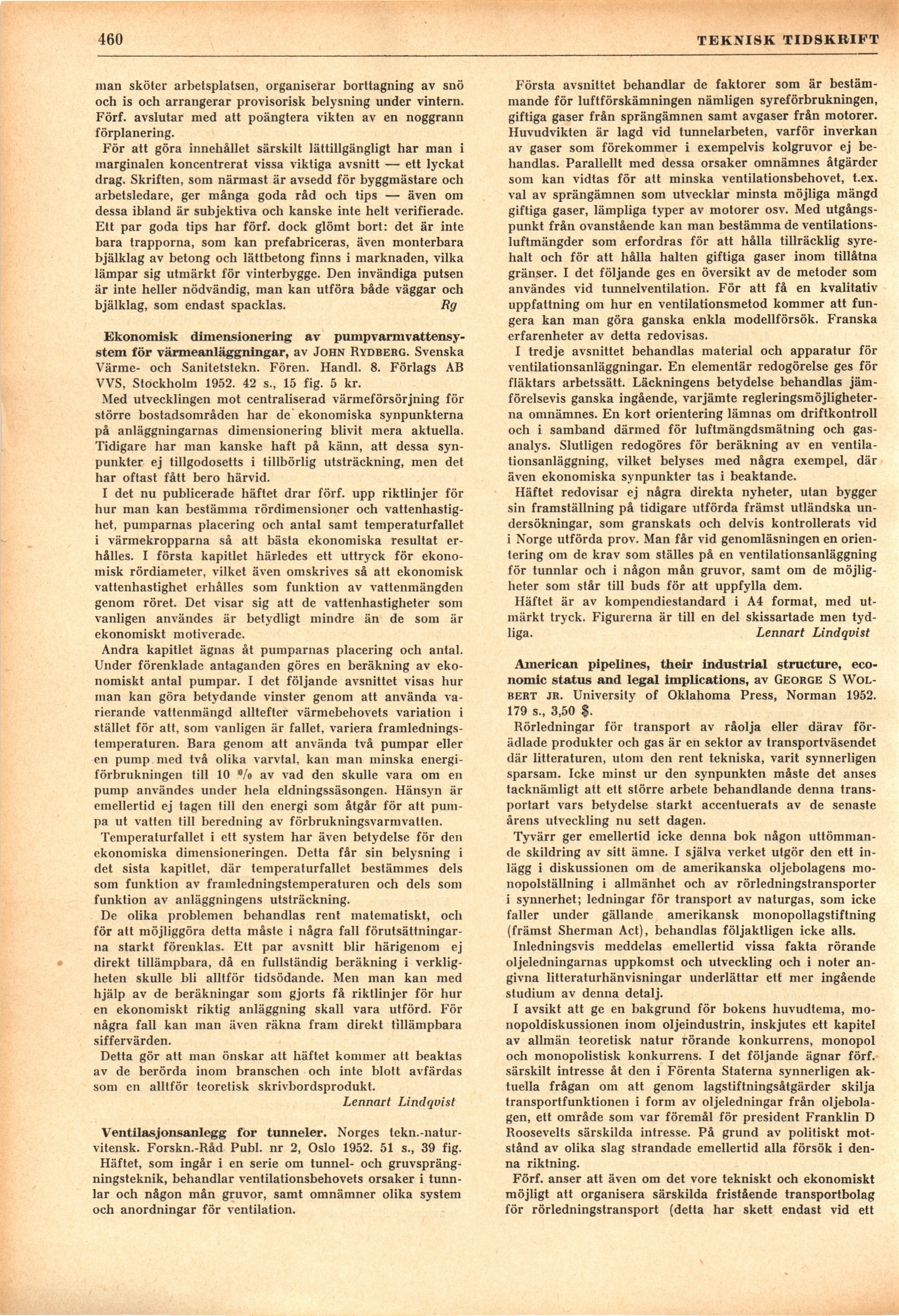 Full resolution (JPEG) - On this page / på denna sida - H. 21. 26 maj 1953 - Böcker - Vinterbygge, av Rg - Ekonomisk dimensionering av pumpvarmvattensystem för värmeanläggningar, av Lennart Lindqvist - Ventilasjonsanlegg for tunneler, av Lennart Lindqvist - American pipelines, their industrial structure, economic status and legal implications, av N G Ehrnrooth