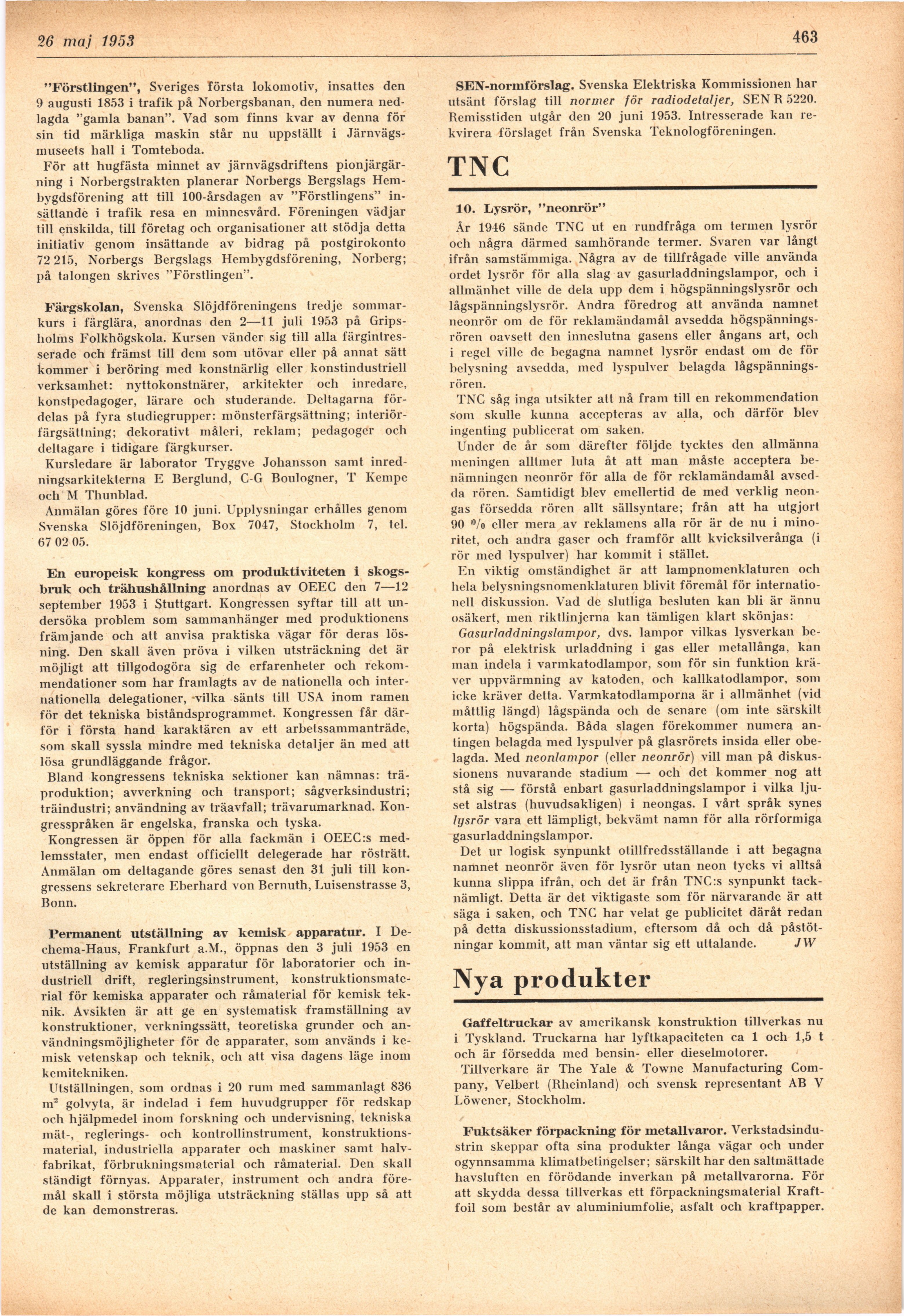 Full resolution (JPEG) - On this page / på denna sida - H. 21. 26 maj 1953 - Hänt inom tekniken - »Förstlingen» - Färgskolan - En europeisk kongress om produktiviteten i skogsbruk och trähushållning - Permanent utställning av kemisk apparatur - SEN-normförslag - TNC: 10. Lysrör, »neonrör», av JW - Nya produkter - Gaffeltruckar - Fuktsäker förpackning för metallvaror