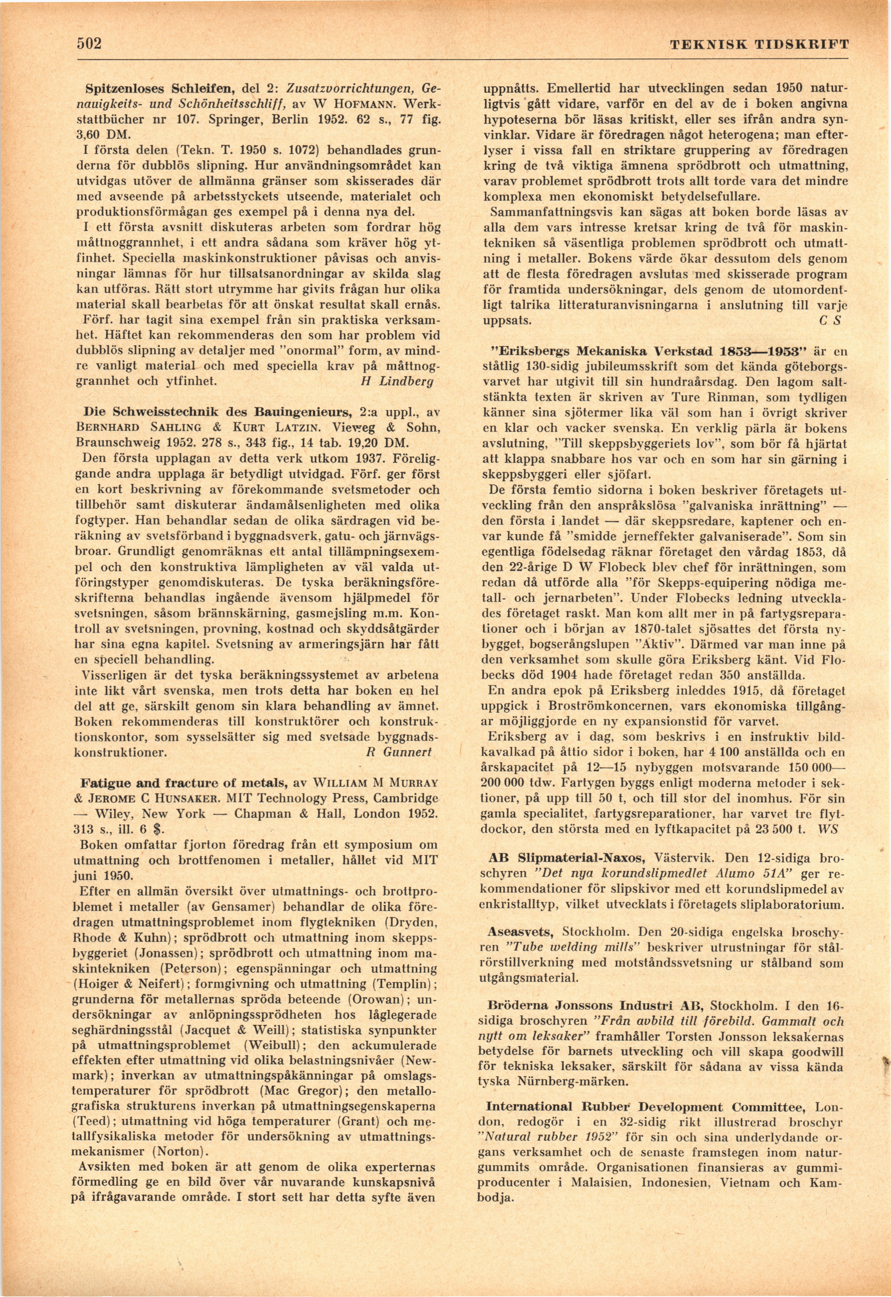 Full resolution (JPEG) - On this page / på denna sida - H. 23. 9 juni 1953 - Böcker - Spitzenloses Schleifen, del 2, av H Lindberg - Die Schweisstechnik des Bauingenieurs, av R Gunnert - Fatigue and fracture of metals, av C S - »Eriksbergs Mekaniska Verkstad 1853—1953», av WS - AB Slipmaterial-Naxos - Aseasvets - Bröderna Jonssons Industri AB - International Rubber Development Committee