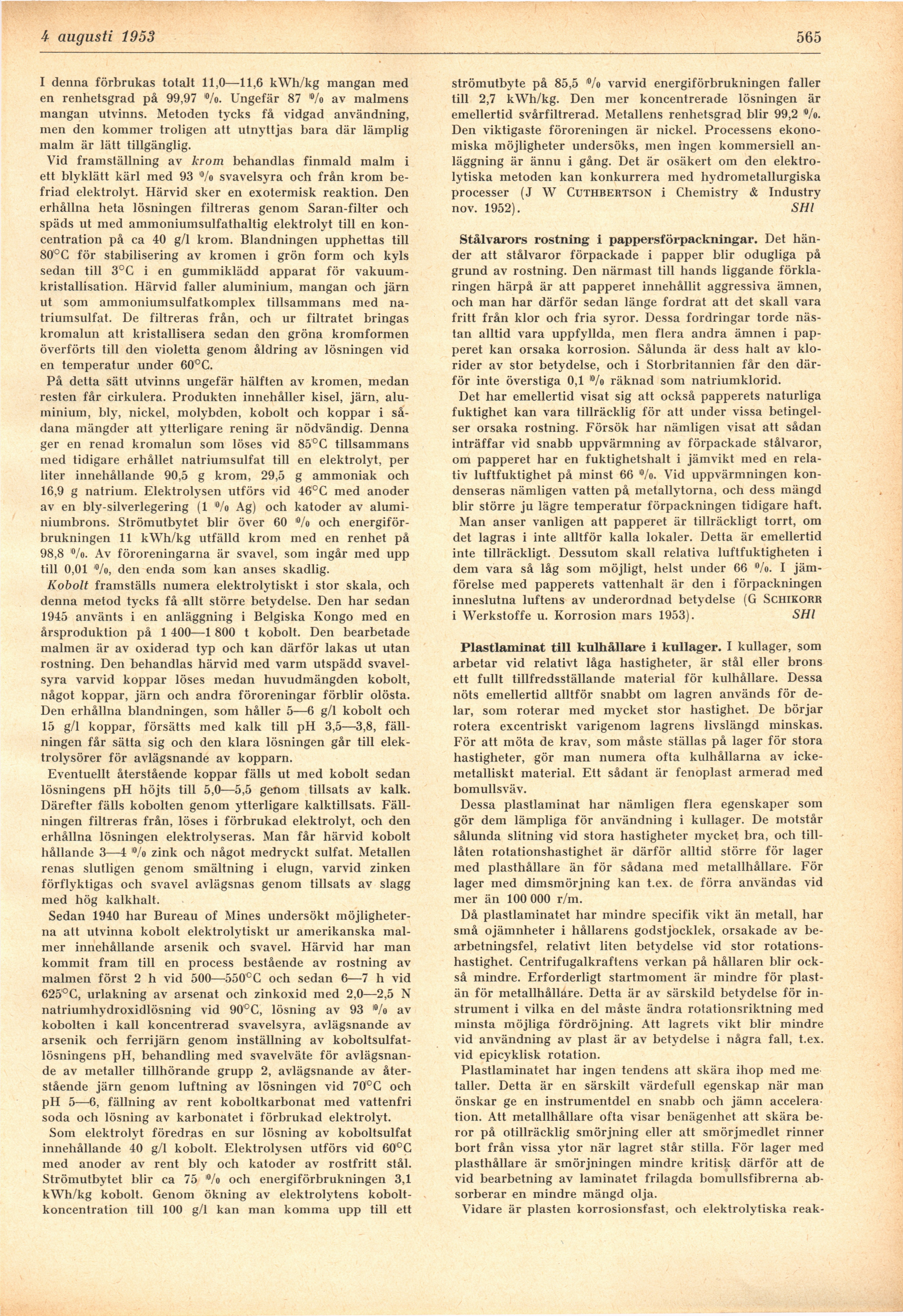 Full resolution (JPEG) - On this page / på denna sida - H. 27. 4 augusti 1953 - Andras erfarenheter - Elektrolytisk framställning av mangan, kobolt och krom, av SHl - Stålvarors rostning i pappersförpackningar, av SHl - Plastlaminat till kulhållare i kullager, av SHl