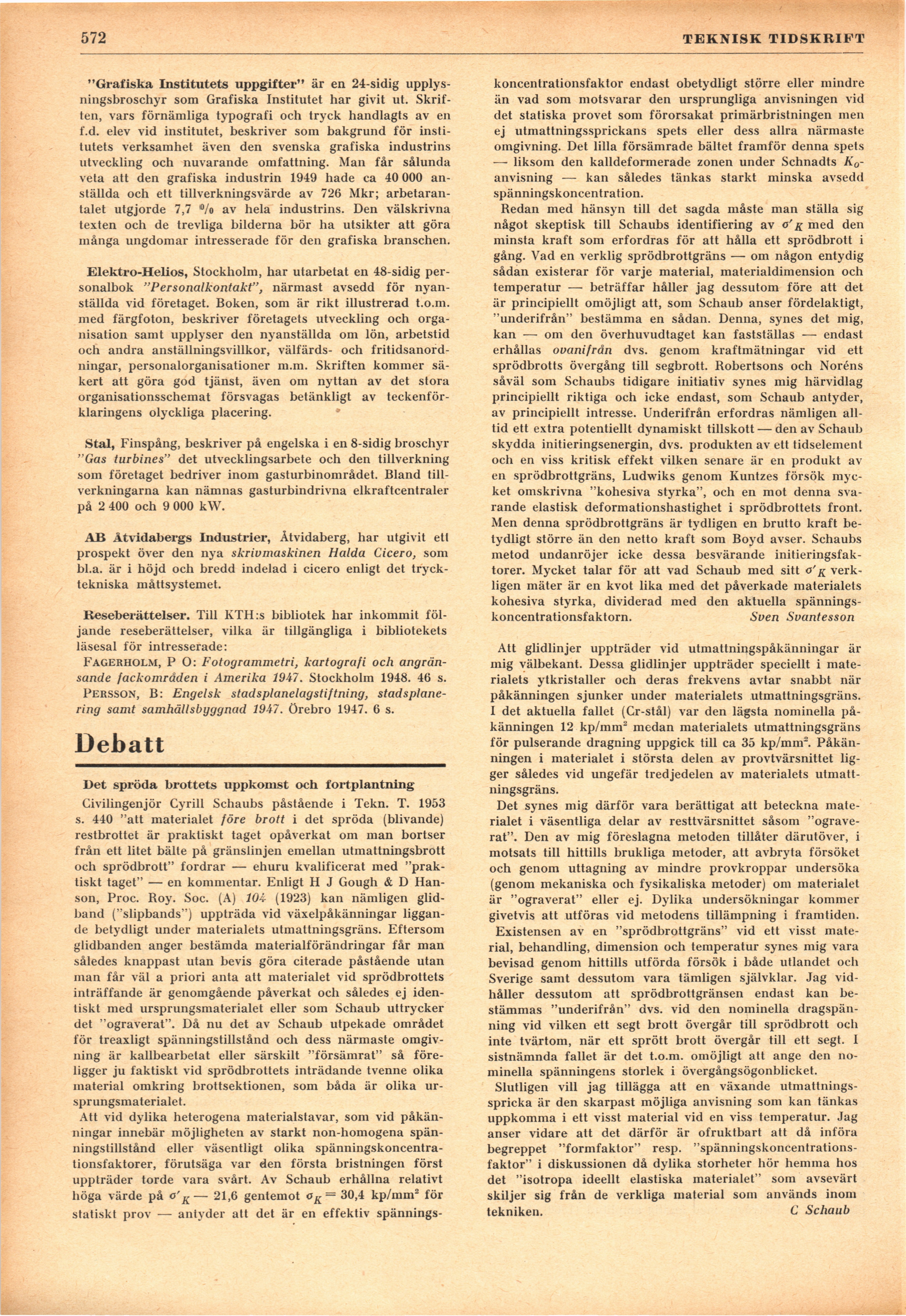 Full resolution (JPEG) - On this page / på denna sida - H. 27. 4 augusti 1953 - Böcker - »Grafiska Institutets uppgifter» - Elektro-Helios - Stal - AB Åtvidabergs Industrier - Reseberättelser - Debatt: Det spröda brottets uppkomst och fortplantning, av Sven Svantesson och C Schaub