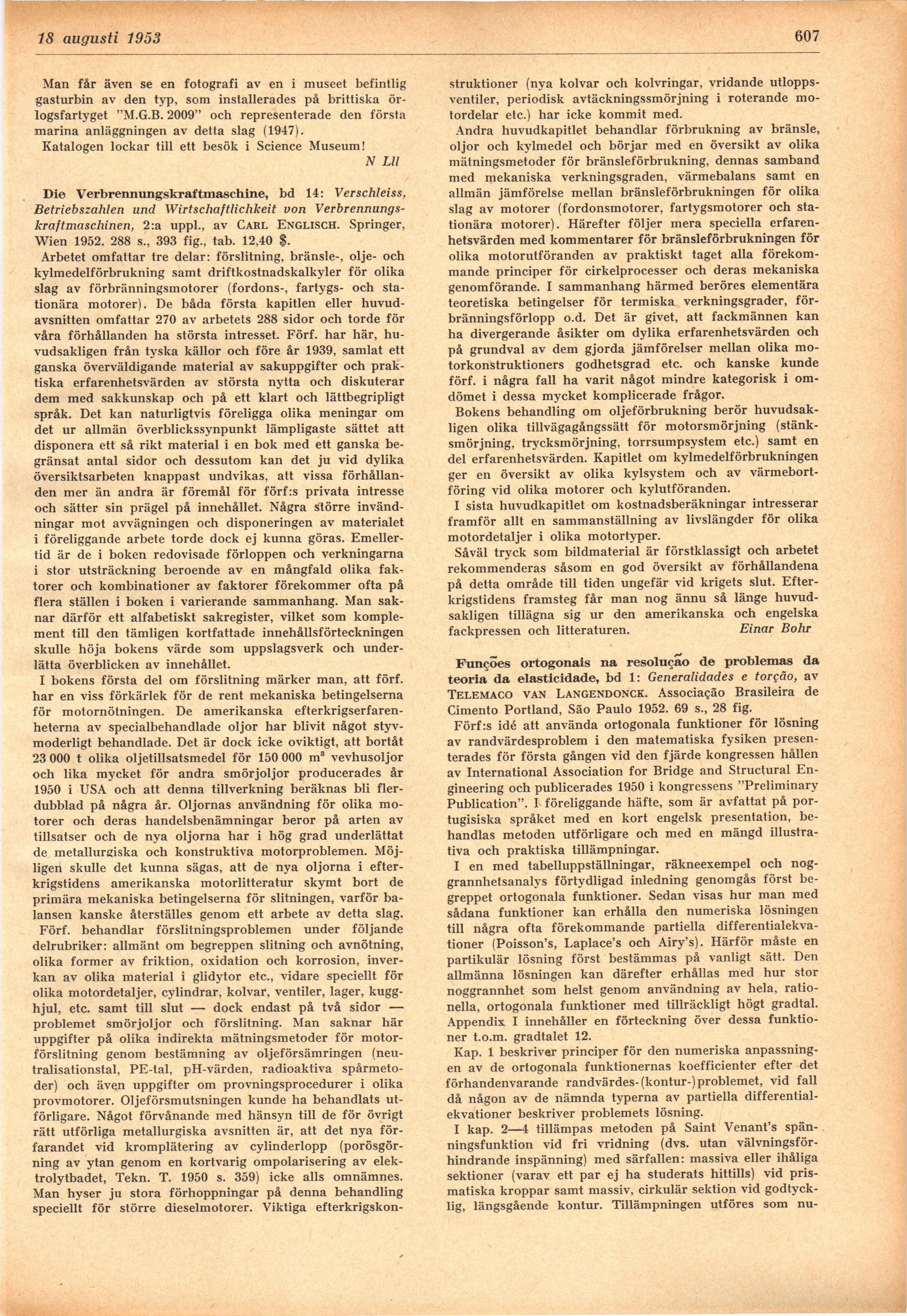 Full resolution (JPEG) - On this page / på denna sida - H. 29. 18 augusti 1953 - Böcker - Handbook of the collections illustrating marine engineering, bd 2, av N Lll - Die Verbrennungskraftmaschine, bd 14, av Einar Bohr - Funções ortogonais na resolução de problemas da teoria da elasticidade, bd 1, av Björn Bergqvist