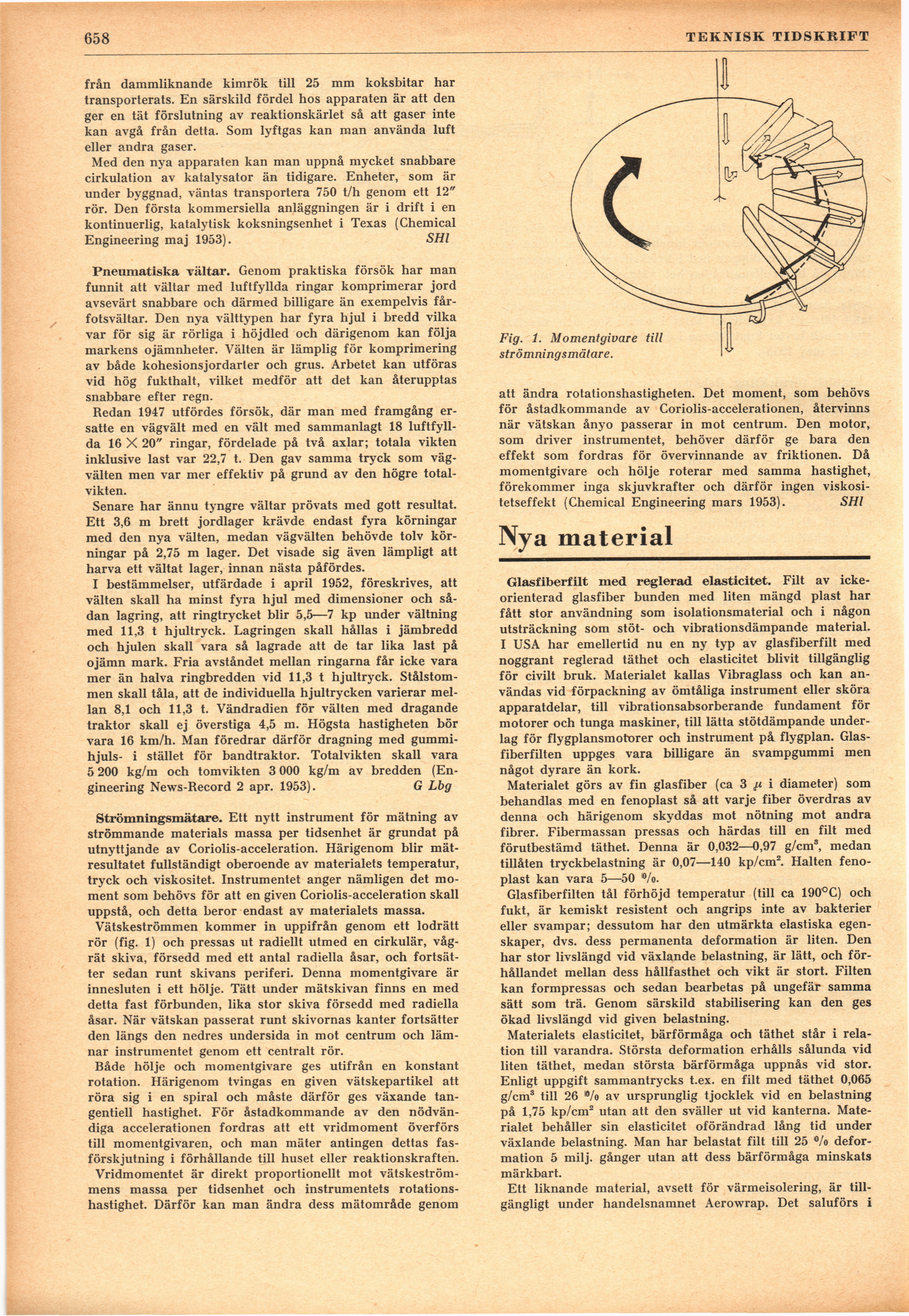 Full resolution (JPEG) - On this page / på denna sida - H. 32. 8 september 1953 - Nya metoder - Gaspump för fasta ämnen, av SHl - Pneumatiska vältar, av G Lbg - Strömningsmätare, av SHl - Nya material - Glasfiberfilt med reglerad elasticitet, av SHl