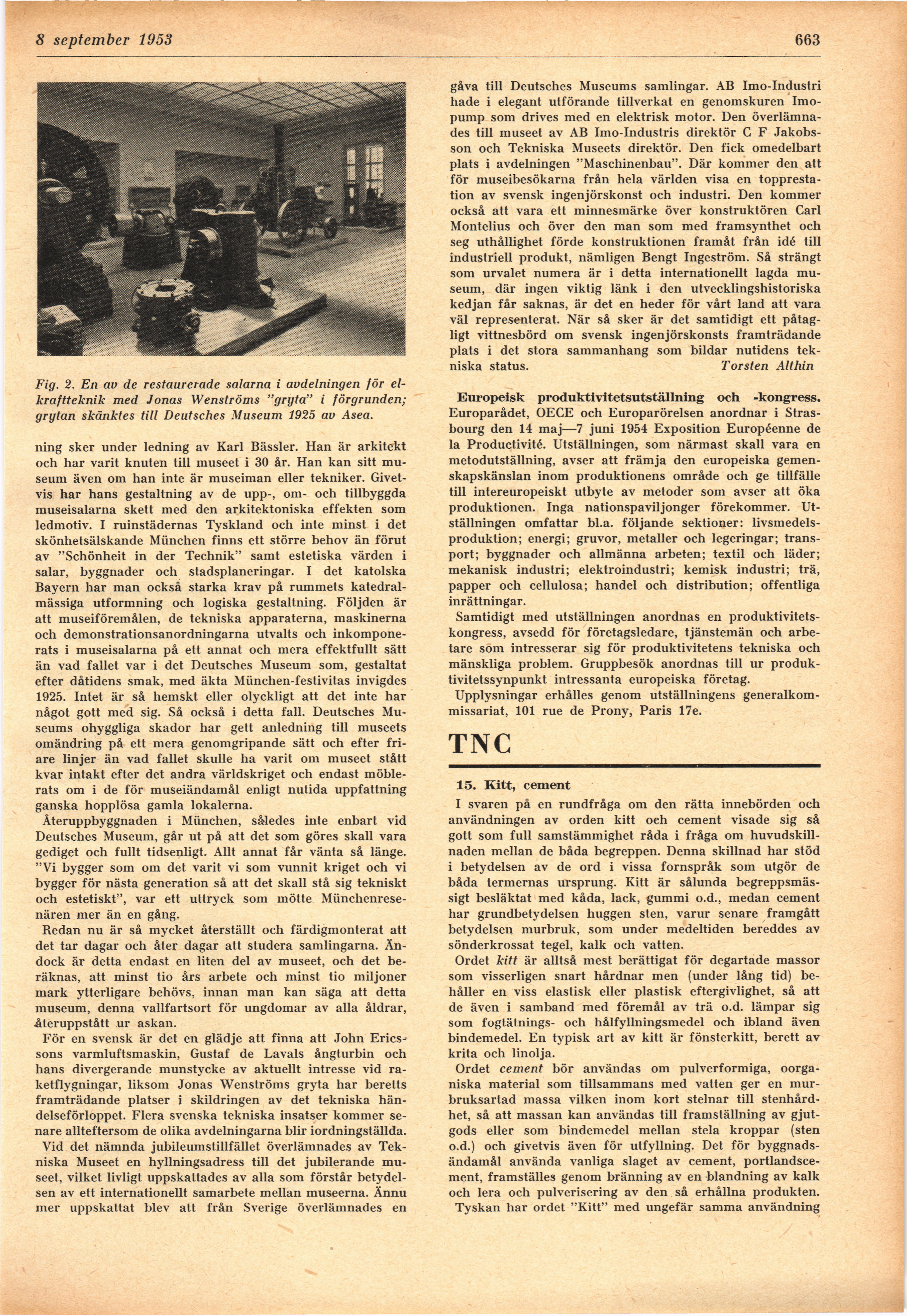 Full resolution (JPEG) - On this page / på denna sida - H. 32. 8 september 1953 - Hänt inom tekniken - Deutsches Museum återuppbyggt, av Torsten Althin - Europeisk produktivitetsutställning och -kongress - TNC: 15. Kitt, cement, av JW