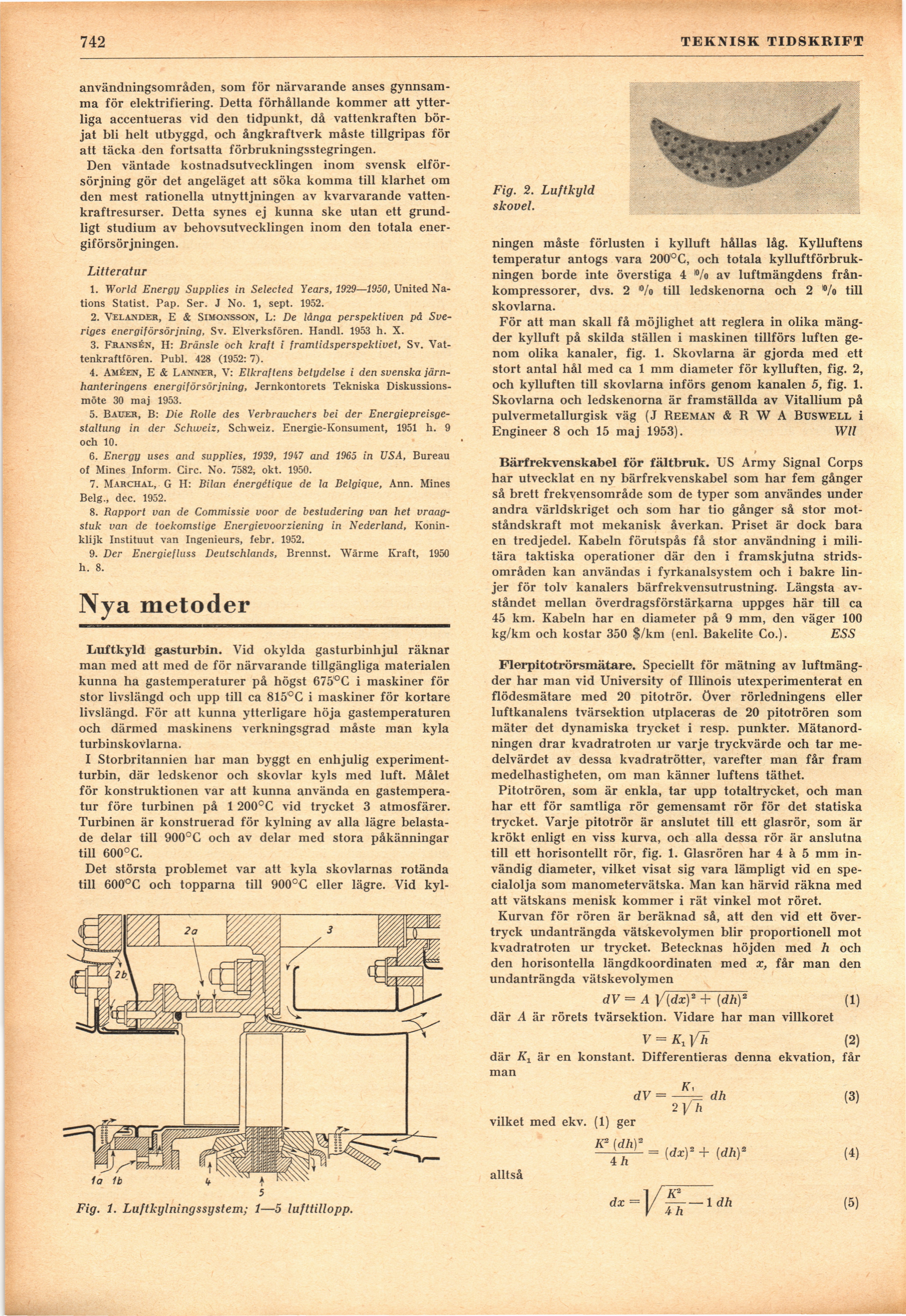 Full resolution (JPEG) - On this page / på denna sida - H. 36. 6 oktober 1953 - Elektricitetens roll i den totala energiförsörjningen, av Sven Lalander - Nya metoder - Luftkyld gasturbin, av Wll - Bärfrekvenskabel för fältbruk, av ESS - Flerpitotrörsmätare, av Wll