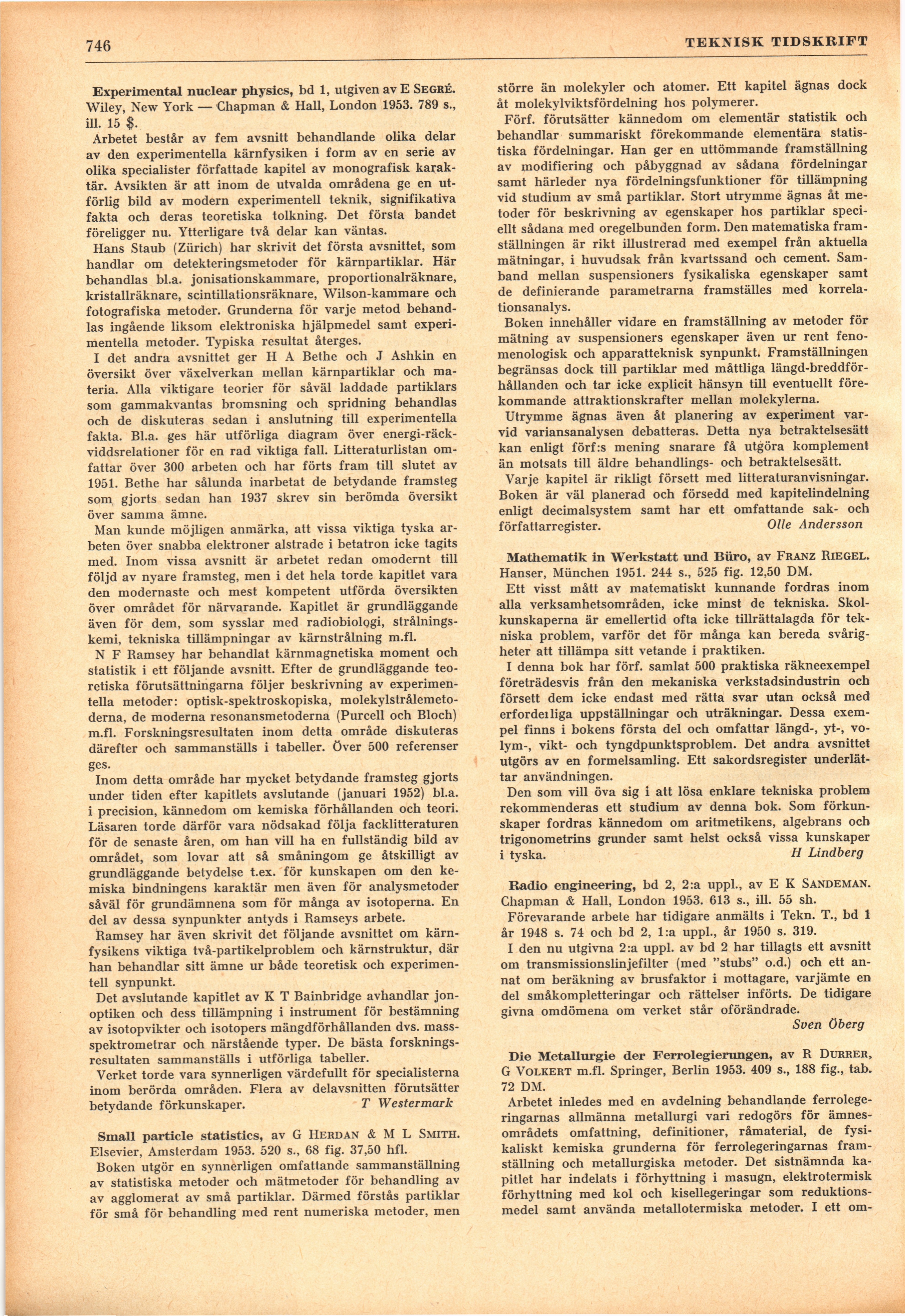 Full resolution (JPEG) - On this page / på denna sida - H. 36. 6 oktober 1953 - Böcker - Experimental nuclear physics, bd 1, av T Westermark - Small particle statistics, av Olle Andersson - Mathematik in Werkstatt und Büro, av H Lindberg - Radio engineering, bd 2 av Sven Öberg - Die Metallurgie der Ferrolegierungen, av E R—s