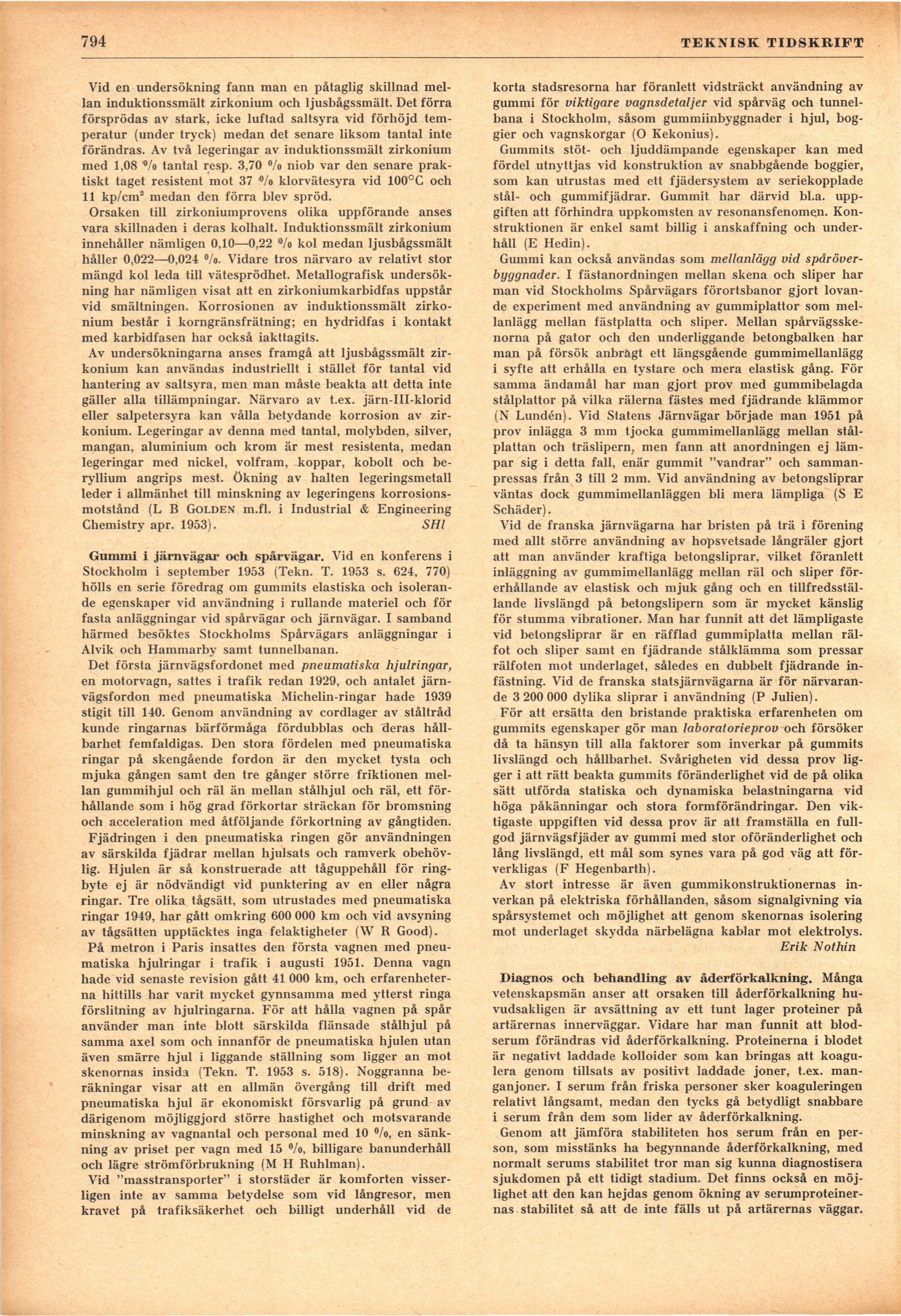 Full resolution (JPEG) - On this page / på denna sida - H. 38. 20 oktober 1953 - Andras erfarenheter - Försprödning av zirkonium i klorvätesyra, av SHl - Gummi i järnvägar och spårvägar, av Erik Nothin - Diagnos och behandling av åderförkalkning, av SHl