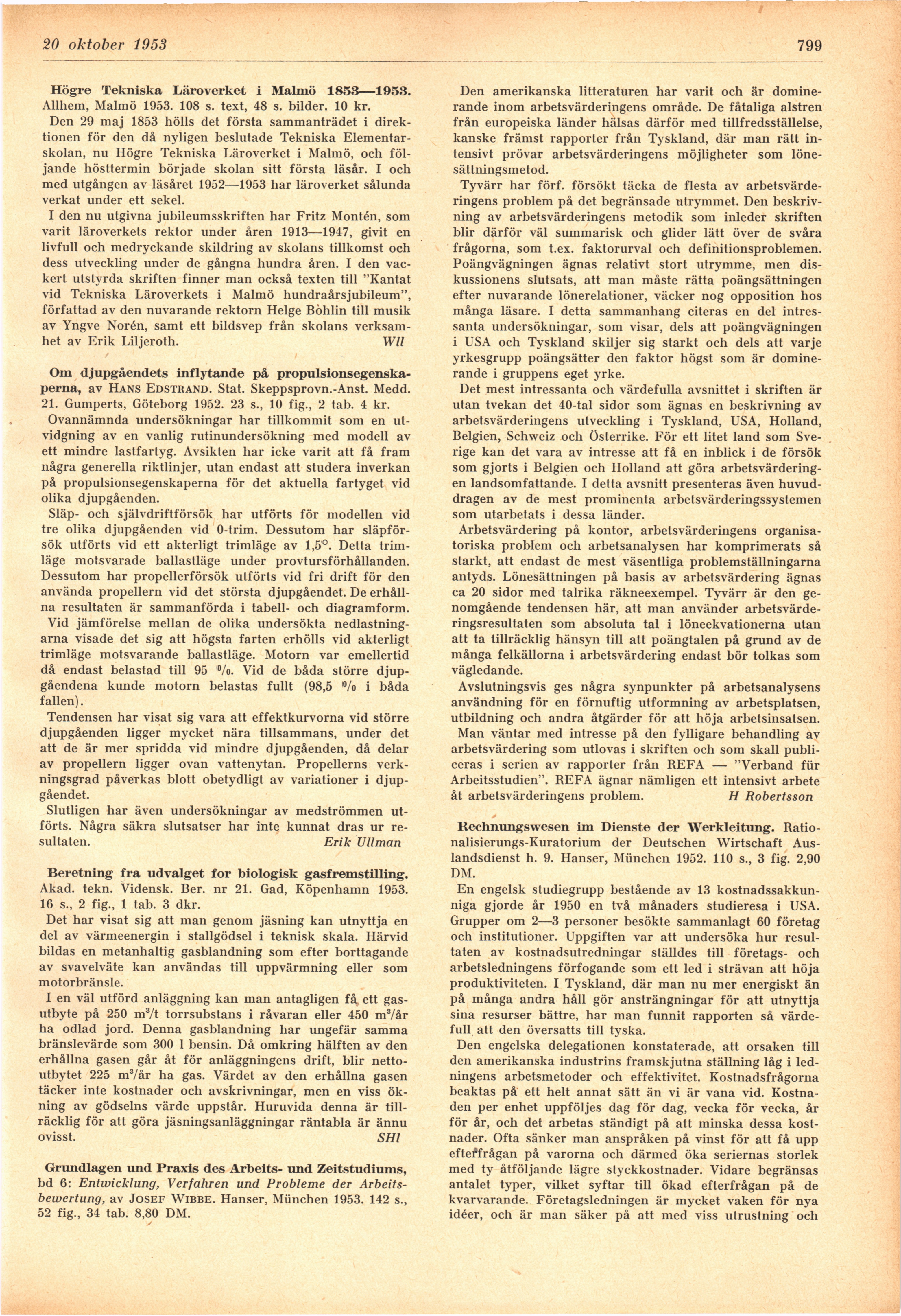 Full resolution (JPEG) - On this page / på denna sida - H. 38. 20 oktober 1953 - Böcker - Högre Tekniska Läroverket i Malmö 1853—1953, av Wll - Om djupgåendets inflytande på propulsionsegenskaperna, av Erik Ullman - Beretning fra udvalget for biologisk gasfremstilling, av SHl - Grundlagen und Praxis des Arbeits- und Zeitstudiums, av H Robertsson - Rechnungswesen im Dienste der Werkleitung, av Yngve Svensson