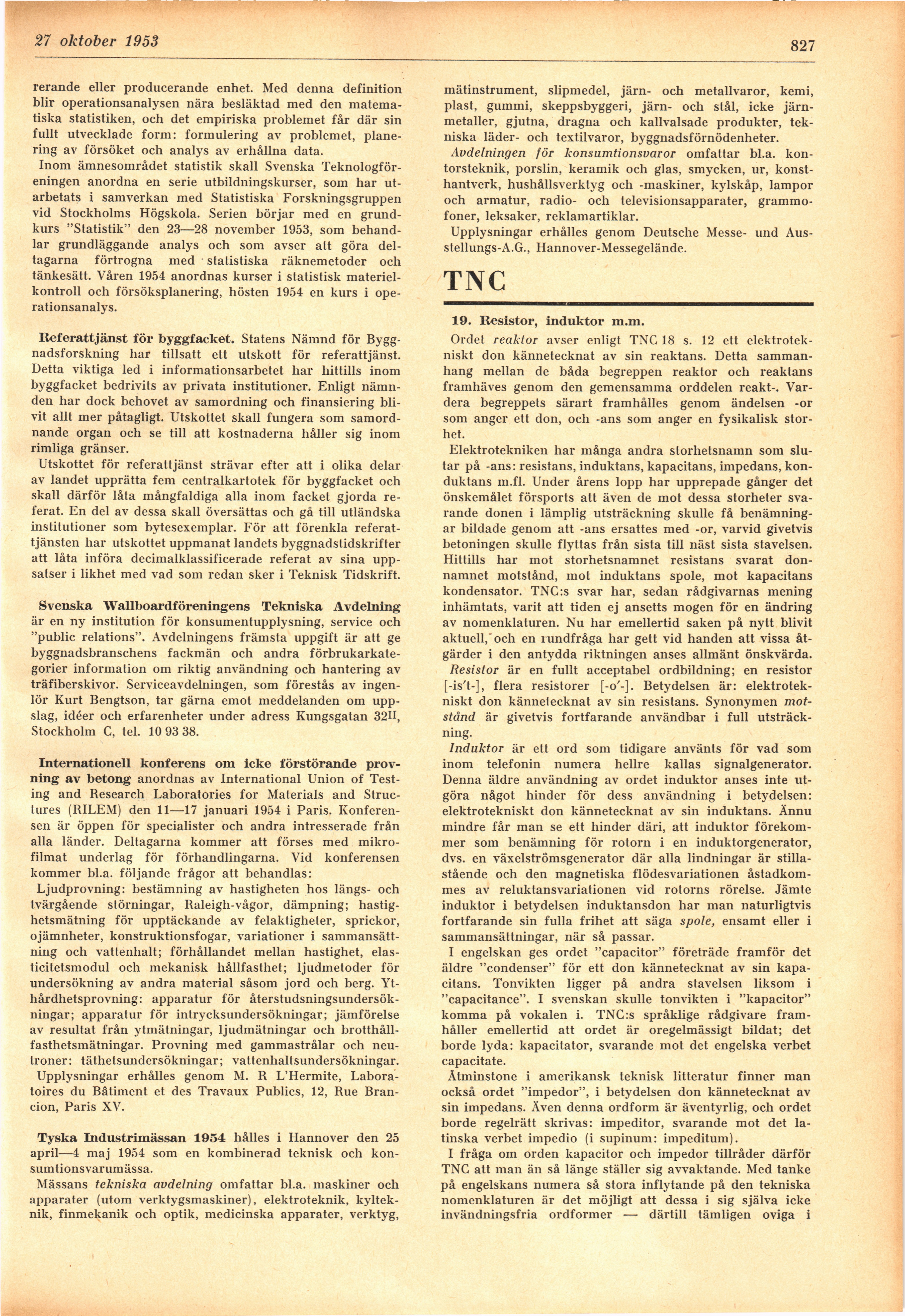 Full resolution (JPEG) - On this page / på denna sida - H. 39. 27 oktober 1953 - Hänt inom tekniken - Kursserie »Statistiska analysmetoder» - Referattjänst för byggfacket - Svenska Wallboardföreningens Tekniska Avdelning - Internationell konferens om icke förstörande provning av betong - Tyska Industrimässan 1954 - TNC: 19. Resistor, induktor m.m., av JW