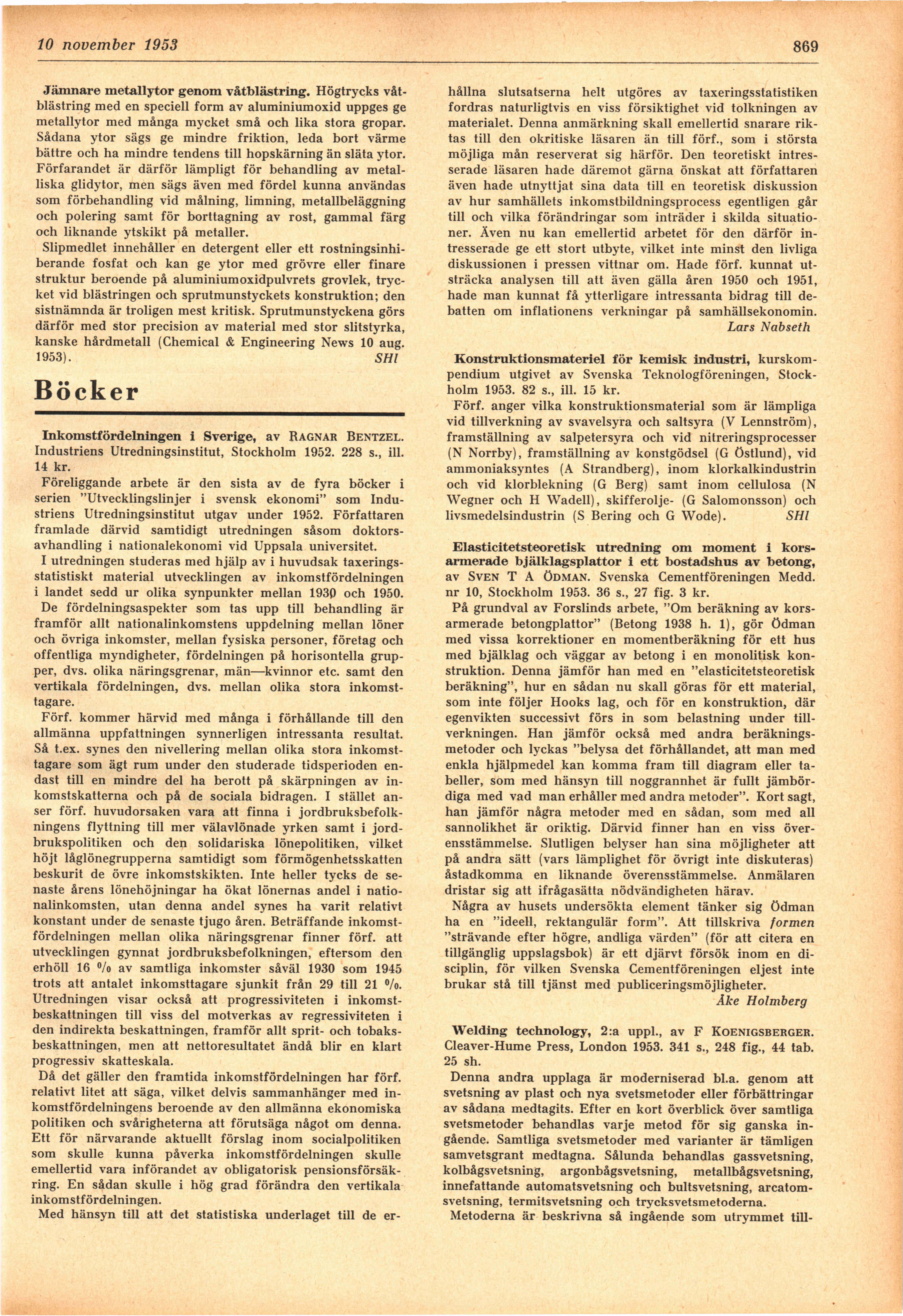 Full resolution (JPEG) - On this page / på denna sida - H. 41. 10 november 1953 - Andras erfarenheter - Jämnare metallytor genom våtblästring, av SHl - Böcker - Inkomstfördelningen i Sverige, av Lars Nabseth - Konstruktionsmaterial för kemisk industri, av SHl - Elasticitetsteoretisk utredning om moment i korsarmerade bjälklagsplattor i ett bostadshus av betong, av Åke Holmberg - Welding technology, av R Gunnert