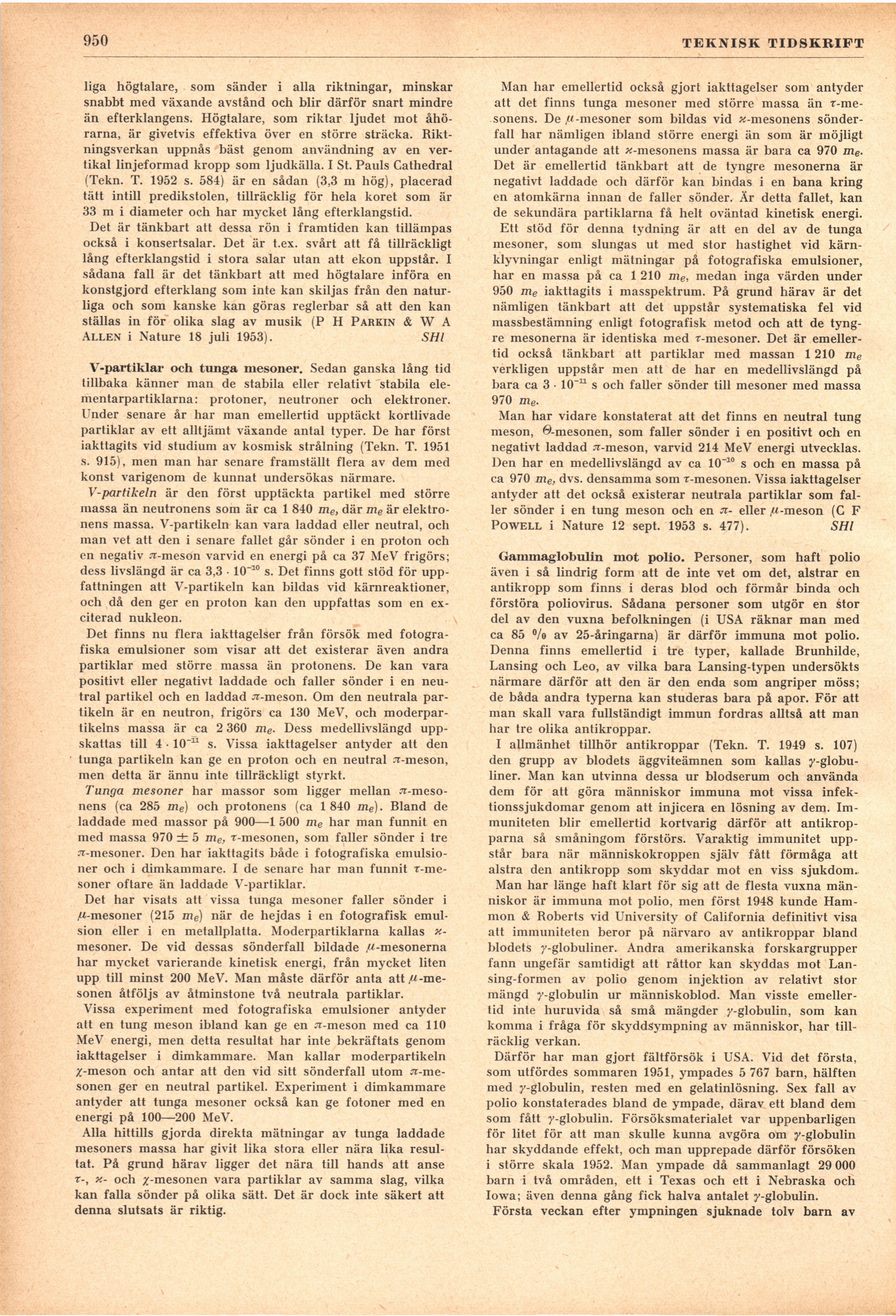 Full resolution (JPEG) - On this page / på denna sida - H. 44. 1 december 1953 - Andras erfarenheter - Akustiken i konsert- och hörsalar, av SHl - V-partiklar och tunga mesoner, av SHl - Gammaglobulin mot polio, av SHl