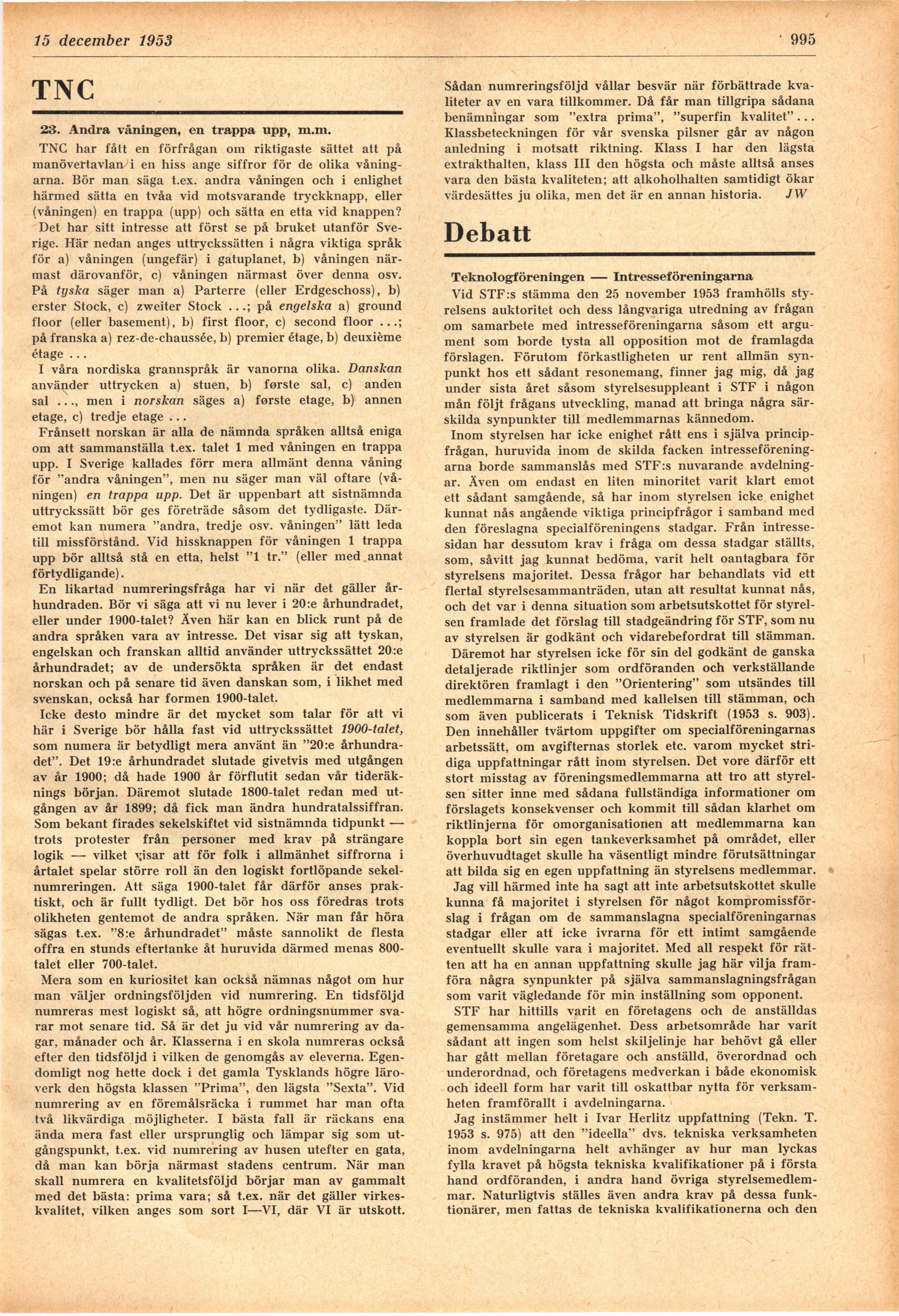 Full resolution (JPEG) - On this page / på denna sida - H. 46. 15 december 1953 - TNC: 23. Andra våningen, en trappa upp, m.m., av JW - Debatt: Teknologföreningen — Intresseföreningarna, av Uno Lamm och Oskar Åkerman