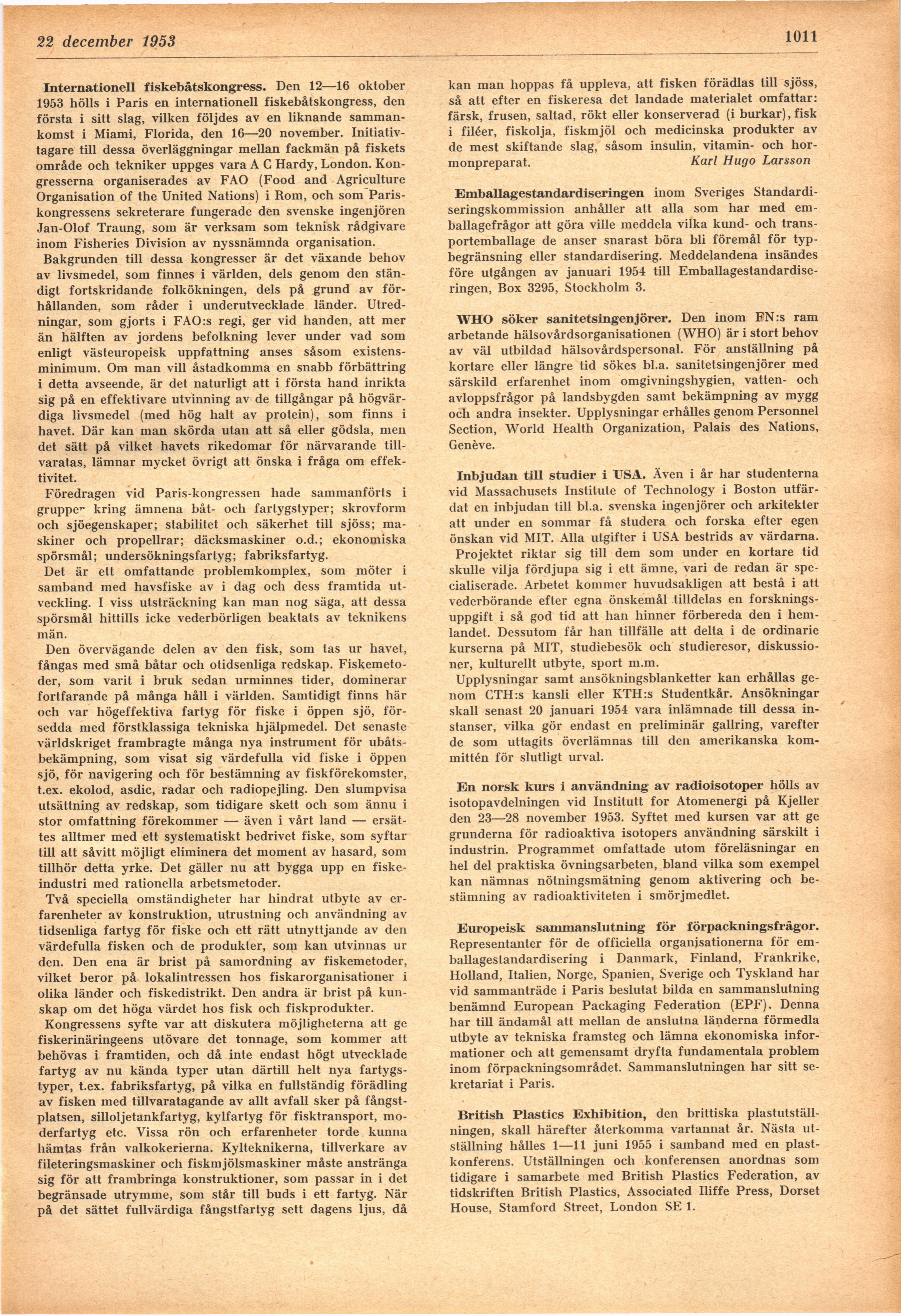 Full resolution (JPEG) - On this page / på denna sida - H. 47. 22 december 1953 - Hänt inom tekniken - Internationell fiskebåtskongress, av Karl Hugo Larsson - Emballagestandardiseringen - WHO söker sanitetsingenjörer - Inbjudan till studier i USA - En norsk kurs i användning av radioisotoper - Europeisk sammanslutning för förpackningsfrågor - British Plastics Exhibition