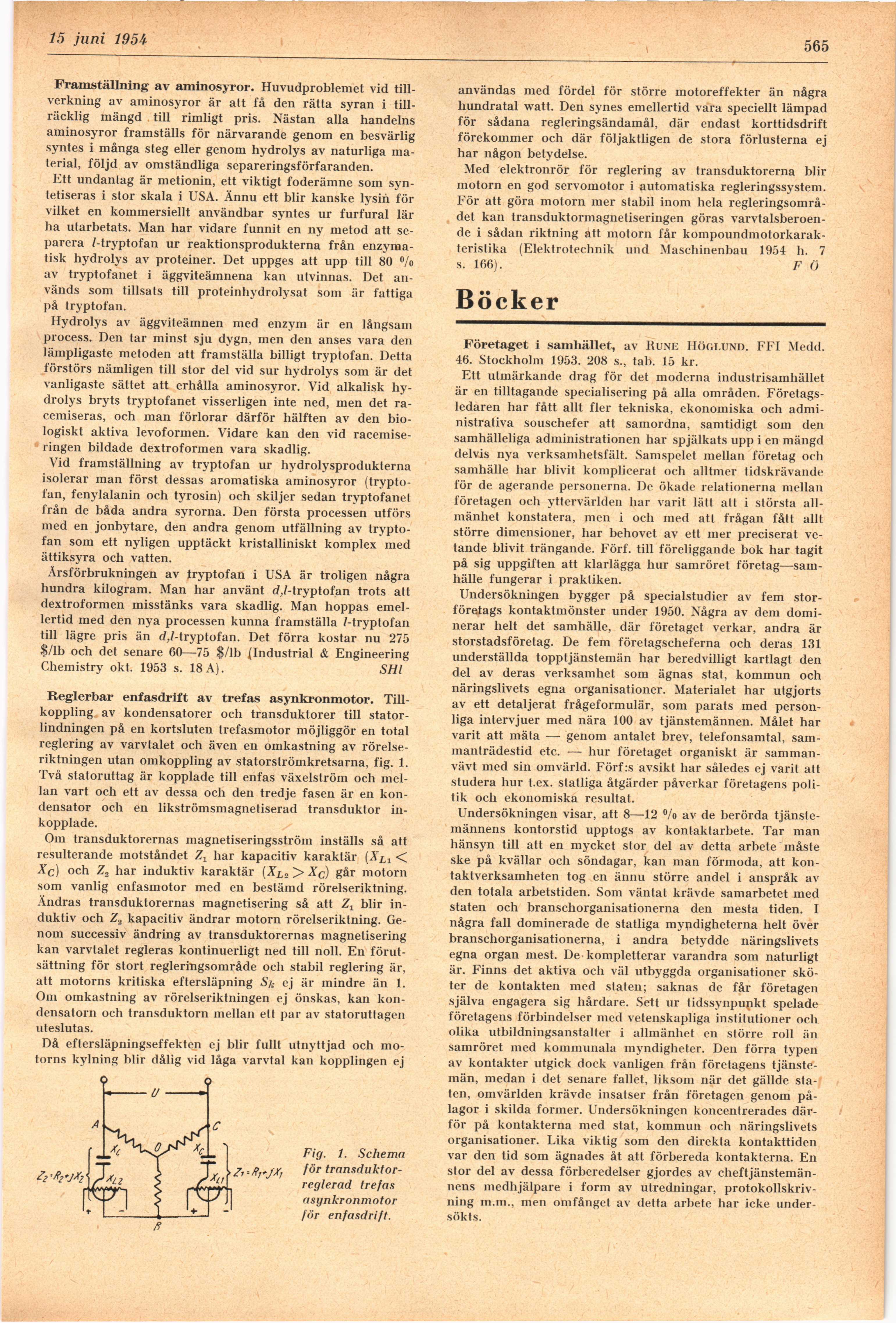 Full resolution (JPEG) - On this page / på denna sida - H. 24. 15 juni 1954 - Andras erfarenheter - Framställning av aminosyror, av SHl - Reglerbar enfasdrift av trefas asynkronmotor, av F Ö - Böcker - Företaget i samhället, av Gösta Walldén